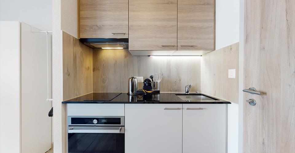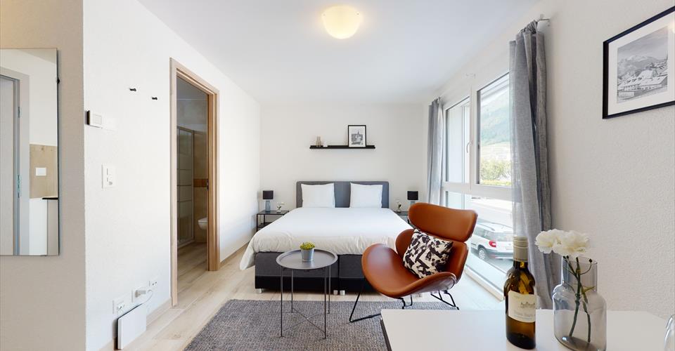 À louer au sein de la résidence Nonanteneuf à Aigle, studio contemporain de 25m2 avec ménage hebdomadaire inclus. Possibilité de louer au mois ! Le studio est entièrement équipé. Il se compose comme suit : Une cuisine ouverte comprenant un four à micro-ondes, une machine à café Nespresso, des plaques vitrocéramiques et un frigo; Une pièce principale comprenant un lit Queen size 160×200, une table, une télévision et une armoire/penderie; Une salle de bain avec un WC, une douche et un lavabo; Buanderie commune en accès libre et gratuit; Parking couvert (place non attribuée); Cave sur demande; Wi-fi et TV compris; Literie et linges fournis. Le logement se situe dans une résidence hôtelière de 5 étages avec un restaurant au rez-de-chaussée. Bénéficiant d’une situation centrale, vous vous retrouverez à quelques pas des cafés, restaurants et commerces d’Aigle. La gare principale se situe à seulement 2 minutes de marche. De là, vous pourrez facilement accéder aux villes environnantes, ainsi qu’aux principaux sites touristiques d’Aigle.