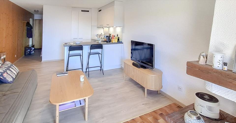 VUE MAGNIFIQUE SUR LA PLAINE & ALPES – TERRASSE DALLEE – RENOVE EN 2024 Studio d’une surface d’env. 37 m2 au rez-de-chaussée et idéalement situé plein Sud, il dispose de : Grand séjour/chambre avec cuisine ouverte (neuve), cheminée décorative et accès à la terrasse 1 alcôve (1 lit de 90/200 cm peut y tenir) Salle d’eau avec baignoire, lavabo & WC Cave & casier individuels Une buanderie commune se trouve dans le bâtiment. Parking public extérieur
