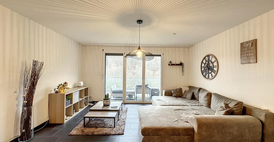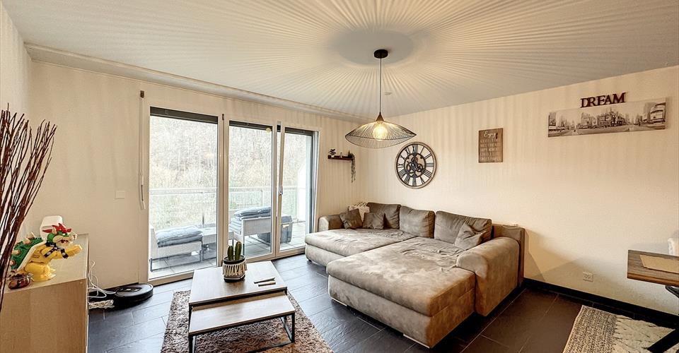 D HOMES SA vous propose en Exclusivité : Très bel appartement de 2.5 pièces offrant une surface habitable de 74m2 et jouissant d’une belle terrasse de 12m2 et d’un balcon de 4m2. La surface Totale pondérée est de 80m2. Ce bien est situé au Rez inférieur d’un bel immeuble résidentiel offrant une belle vue dégagée. L’appartement est spacieux et très lumineux et en excellent état. La distribution est la suivante : Rez: – Cuisine agencée et équipée, ouverte sur le séjour – Salon / Séjour – Terrasse de 12m2 – WC visiteurs 1er étage: – 1 chambre à coucher avec armoires encastrées – 1 salle de bains – WC – 1 balcon de 4m2 Cet appartement dispose d’une cave privée et d’une buanderie commune. 1 places de parc couverte complète ce bien au prix de chf 25’000 en sus du prix de vente. Les écoles, transports publics et commerces sont à proximité. A noter que cet appartement est actuellement loué au prix de chf 25’800.- par année. Pour les visites, merci de nous contacter : par ou par