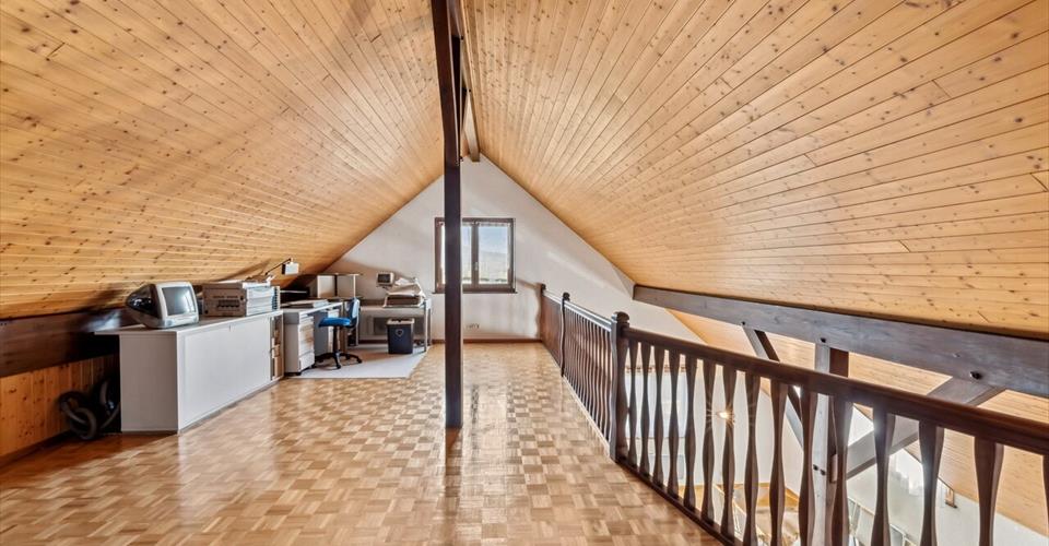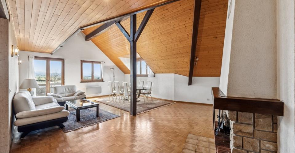 Situé au dernier étage d’une petite PPE, cet appartement de 2.5 pièces et 112m² offre un cadre de vie chaleureux et fonctionnel. Son agencement en duplex avec mezzanine ajoute du volume à ce bien parfaitement entretenu. Dès l’entrée, vous découvrirez un bel espace de vie, composé d’un coin salon/salle à manger avec cheminée et d’un accès au balcon. La cuisine fermée et équipée, entièrement rénovée en 2004, bénéficie également d’un accès au balcon. Un couloir avec armoires murales apporte un espace de rangement supplémentaire, tandis qu’une grande chambre et une salle de bain avec WC complètent ce niveau. À l’étage, une spacieuse mezzanine d’environ 20m² offre un espace polyvalent, parfait pour un bureau, un coin détente ou une seconde chambre. Ce bien est complété par une cave de 9m² et une place de parking souterrain, équipée d’une borne de recharge pour véhicules électriques. Situé dans un environnement calme, cet appartement représente une opportunité idéale pour ceux à la recherche d’un bien, alliant confort et praticité.