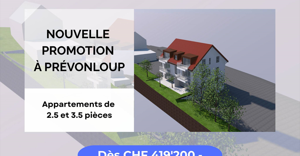 Découvrez cette nouvelle promotion au cœur du village de Prévonloup! La résidence est constituée de 6 appartements de 2.5 et 3.5 pièces. Cet appartement de 2.5 pièces se compose de la manière suivante : Un hall d’entrée avec armoire murale, une cuisine ouverte sur le séjour de 30.70m2, une chambre à coucher de 13.70m2, une salle de bains et un balcon de 4.80m2. Une place de parc intérieure (CHF 30’000.- en sus) et une cave complètent ce bien. Vente en quote-part terrain pour des frais d’achat réduits ! INFORMATIONS ET VISITES : ALEXANDRA JEREZ & TANIA LEITE