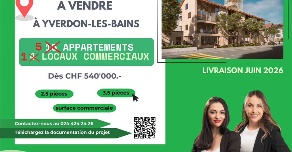 Bernard Nicod SA a le plaisir de vous présenter en exclusivité son projet « Silo Renaissance » dans la charmante ville d’Yverdon-les-Bains! Figure emblématique de la ville d’Yverdon-les-Bains, l’ancien Moulin, réputé pour ses farines artisanales, va subir une transformation spectaculaire pour donner naissance au nouveau projet Silo Renaissance, mêlant habitation et commerces. Dans le souci de préserver l’histoire du Moulin d’Yverdon, les volumes d’origine ont été préservés, tandis que le Silo a été repensé sous la forme d’une tour abritant bureaux et jardins potagers. La résidence se composera de 15 appartements modernes de 1.5 à 5.5 pièces, 1 surface commerciale et 2 bureaux. Cet appartement se situe au 1er étage et se compose comme suit : Un hall d’entrée avec armoires murales, une cuisine ouverte sur le séjour/salle à manger avec accès au balcon couvert. Une chambres à coucher ainsi qu’une salle de douche/WC. Chaque appartement disposera d’une cave et d’une place de parc intérieure (CHF 35’000.- en sus). Aménagez vos pièces, choisissez la cuisine de vos rêves et finissez vos intérieurs selon vos goûts. Votre futur logement sera spacieux, confortable et adapté à votre mode de vie. Choisissez l’appartement idéal : 1.5 pièces dès 29m2 à partir de CHF 300’000.- 2.5 pièces dès 56m2 à partir de CHF 540’000.- 3.5 pièces dès 70m2 à partir de CHF 690’000.- 5.5 pièces dès 112m2 à partir de CHF 1’050’000.- LES ATOUTS : • Production de chauffage par pompe à chaleur (air/eau) • Chaque appartement dispose d’un espace extérieur • Finitions au choix de l’acheteur • Panneaux photovoltaïques (pour une diminution de votre facture d’énergie) • Thermostat d’ambiance dans toutes les pièces • Construction par l’entreprise générale BERNARD NICOD SA Les appartements seront livrés au printemps 2026. La ville jouit d’un patrimoine historique varié, réuni dans la vieille ville et ses musées. Le Centre Thermal avec ses centres de soins est composé de 3 bassins dont deux extérieurs. Des activités nautiques telles que la location de pédalo ou de paddle sont à votre disposition à la Plage. Hôtels et restaurants divers et variés offrent aux habitants le plaisir de la dégustation et la recherche de nouvelles saveurs. Découvrez votre futur lieu de vie en prenant contact avec notre équipe pour une présentation complète de notre projet et profitez ainsi de conseils personnalisés par nos courtières : ALEXANDRA JEREZ et TANIA LEITE.