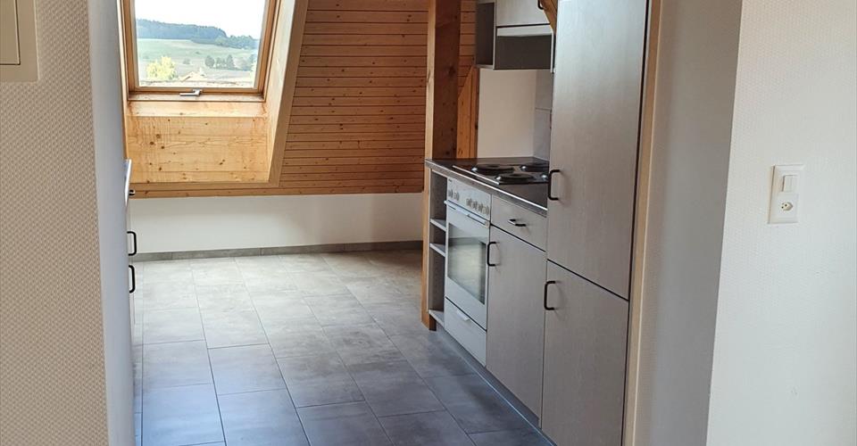 Situé au 2ème étage d’un bâtiment villageois entièrement rénové en 2015, ce charmant appartement de 2.5 pièces de 58m2 env. avec poutres apparentes saura séduire les candidats à la recherche d’un logement chaleureux et pratique, au cœur d’un village dynamique. Description : Salon lumineux Armoire intégrée Cuisine entièrement agencée avec coin repas Salle de bain spacieuse avec douche Chambre à coucher mansardée Cave Buanderie commune avec machine à laver et séchoir (système à carte) 1 Place de parc extérieure en sus (CHF 50.-/mois) Situation et commodités : À seulement quelques minutes à pied, vous trouverez toutes les commodités nécessaires : Transports publics en direction de Lausanne, Echallens, Moudon et Yverdon (2 min) Coop, Migros, pharmacie, centre médical avec médecin, dentiste, physiothérapeute, boulangerie, boucherie, restaurant, Poste et banque Raiffeisen. École (3 min) et garderie (2 min) Conditions : Loyer : CHF 1’300.-/mois Charges : CHF 100.-/mois 1 Place de parc extérieure en sus (CHF 50.-/mois) Disponible : 01.11.2025 (à discuter) Cet appartement plein de cachet, idéalement situé, constitue une belle opportunité pour profiter de la vie à la campagne tout en restant connecté aux grands axes.