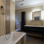 L’appartement comprend deux salles de bains – une avec baignoire, lavabo et toilettes et une autre avec douche, lavabo et toilettes – offrant un confort pour tous les résidents. Le grand salon, avec coin canapé, TV et table à manger, est parfait pour socialiser et organiser des réunions. Avec des meubles modernes, Krusty combine style et confort dans un cadre urbain dynamique.