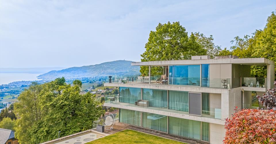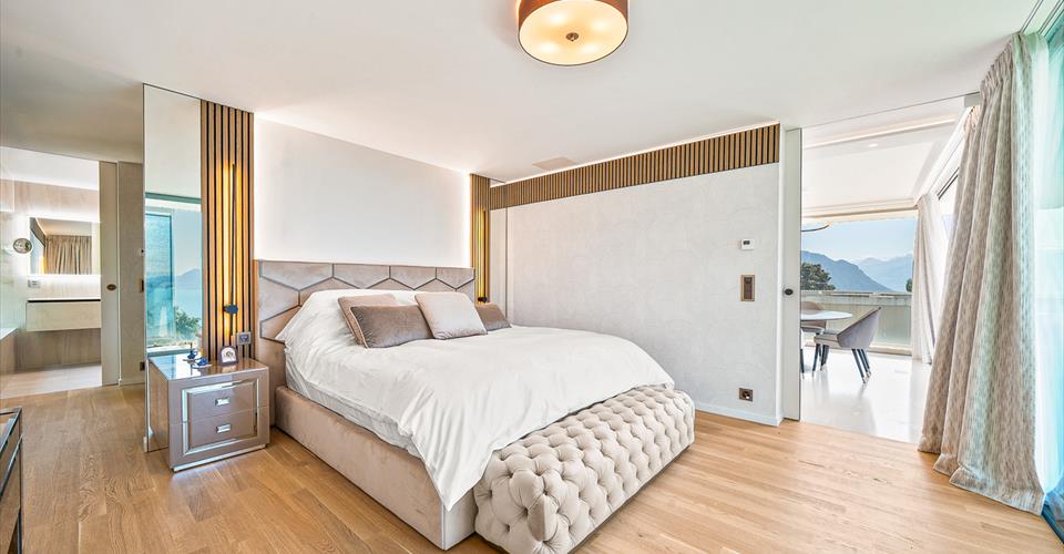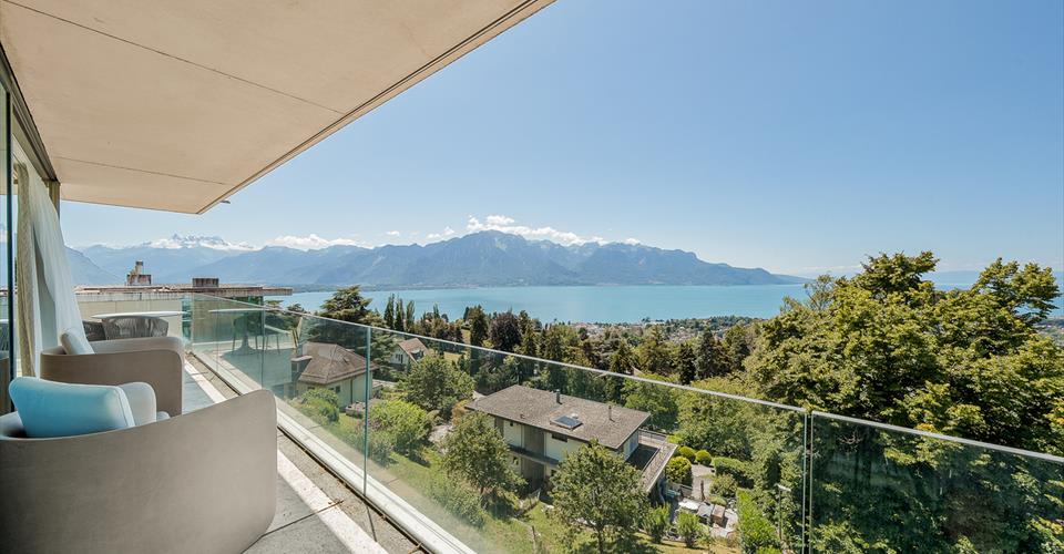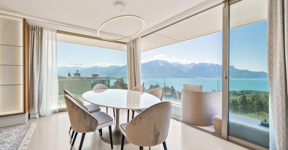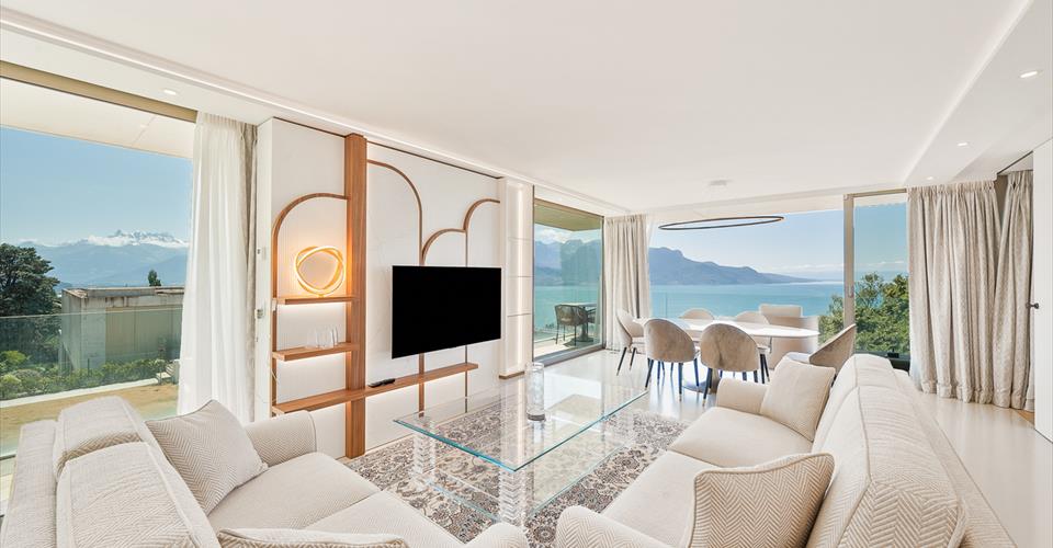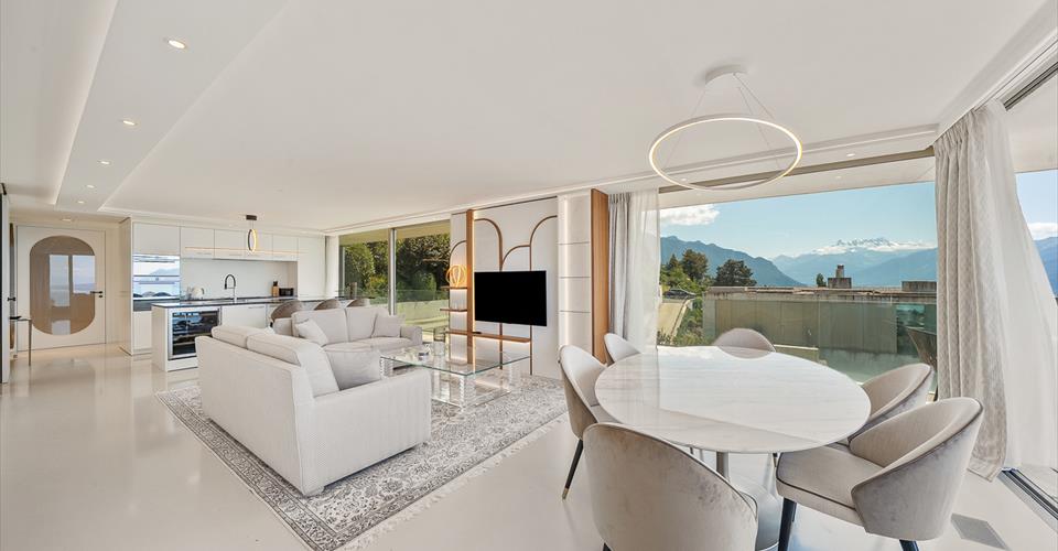 Ce splendide appartement situé dans les hauts de la ville réputée de Montreux et ses prestigieux quais. Son emplacement au cœur d’un environnement calme et résidentiel est particulièrement prisé pour ceux à la recherche de quiétude. Occupant l’entier du 3ème étage avec accès par ascenseur directement dans l’appartement, cette une luxueuse résidence contemporaine composée de deux bâtiments de 4 logements chacun construits en 2010, Cet appartement offre un splendide et unique panorama sur le Léman et profite d’une luminosité sans pareille grâce à ses grandes baies vitrées et son orientation sud-ouest. Ce magnifique appartement de 3.5 pièces de 130 m2 profite d’une surface pondérée de 151 m2. L’aménagement intérieur et la distribution entièrement revu en 2024, il possède de magnifique pièces à vivre ainsi qu’une splendide Masterbedroom avec vue lac. La seconde chambre possède également son espace dressing et salle de douche privative. La qualité des finitions et de l’exécution se réunissent pour produire une réussite exceptionnelle. La réalisation est épurée et contemporaine. Appartement : CHF 2’990’000.00 comprenant 2 places de parc agréables dans le garage et une cave Mobilier sur mesure, neuf, en sus : CHF 200’000.00.