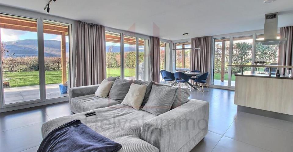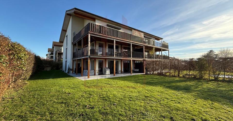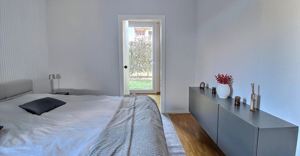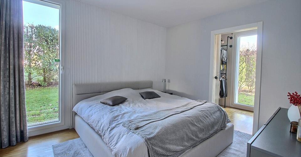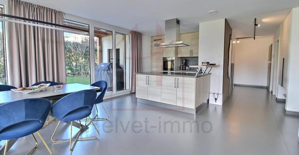 En exclusivité chez Helvet-immo : Situé en rez-de-jardin d’un immeuble construit en 2013, cet appartement traversant de 3.5 pièces a été entièrement rénové en 2022 avec des matériaux de grande qualité, et selon un style contemporain. Il offre un cadre de vie confortable et lumineux grâce à ses grandes baies vitrées ouvertes sur une terrasse en angle et son grand jardin plat de plus de 400m2. La vue est superbe, dégagée sur la campagne et le Jura. Parfaitement agencé, avec deux chambres et deux salles de bains, une pièce à vivre très spacieuse, ce bien est idéal pour toute personne recherchant espace et fonctionnalité, à proximité immédiate des commodités et des transports. Ce bien comprend également une grande cave privative et une place de parc intérieure à CHF 40’000.- en sus. Situé à proximité immédiate des commerces, écoles et transports publics, il offre un cadre de vie exceptionnel. Disponible rapidement. Plus de détails, les plans et la distribution sur demande de brochure. Contactez-moi