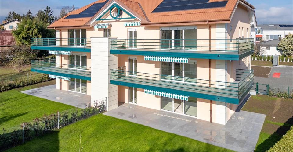 Appartement de 3.5 pièces neuf avec spacieuse terrasse/ jardin. Dans un cadre privilégié, bénéficiant d’un environnement verdoyant au calme total, ce bel appartement neuf est distribué sur une surface de 128 m2 pondérés. Celui-ci offre un bel extérieur privatif avec une terrasse de 53 m2 et un jardin de près de 230 m2. L’intérieur propose une distribution fonctionnelle et confortable avec un espace de vie de 38 m2 bordés de nombreuses baies vitrées. L’espace nuit est, quant à lui, composé d’une suite avec espace dressing et salle d’eau, une 2ème chambre à coucher et un salle-de-bains. Les finitions restent au choix des acquéreurs. Deux parkings, un intérieur dans le garage souterrain et le 2ème extérieur, complètent les prestations du bien, en sus. Ce logement fait partie de la nouvelle PPE “Domaine du Nipy – 2ème étape” à Eysins, construction qui séduit par son exposition plein sud ouvert sur la campagne et les montagnes. Six appartements lumineux et de grand confort se partagent le domaine. Un cadre de vie mariant modernité et authenticité. Le village d’Eysins est idéalement situé à mi-chemin de Lausanne et Genève. Les petits commerces se trouvent sur place et toutes les commodités propres à une vie citadine ainsi qu’accès autoroutiers à 3 min en voiture. Votre contact pour toutes informations ou visite : Peter Oscarsson