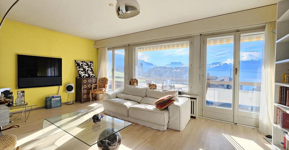 Sur la Commune de Montreux, à Chernex, joli appartement d’env. 89 m2 avec cheminée, jouissant d’un grand balcon d’env. 33 m2 (CHF 6’509.-/m2). Actuellement 1 chambre. Possibilité de recréer une 2ème chambre à la place du dressing. Belle vue sur le lac et les montagnes. Il est situé proche de la gare du MOB et des commerces. La vente de ce logement est autorisée aux étrangers non-résidents et en résidence secondaire. Divers : Garage box No 12 en sus à CHF 50’000.- Ascenseur Cave Buanderie commune