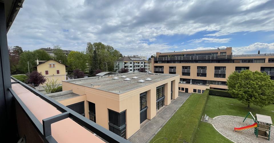 Idéalement situé à quelques 5 minutes de la gare et du centre-ville à pied, cet appartement lumineux au 4ème étage est situé. L’appartement de 76m2 dispose de beaux volumes ouverts et un grand balcon d’environ 19m2 orienté sud ouest. Il comprend une cuisine totalement agencée et équipée ouverte sur le séjour espace salle à manger. Deux spacieuses chambres, une salle de bains avec colonne lave linge et sèche linge ainsi qu’un WC visiteurs complètent ce bien. De nombreux rangements encastrés dans le couloir et l’entrée optimisent l’espace de vie. Une cave de 6m2 et une place de parc dans le parking souterrain parc avec accès direct à l’ascenseur de l’immeuble (CHF 50’000.-) en sus du prix de vente. L’appartement est libre dès le 1er juin 2025. Situé dans une zone calme proche de gare et du centre-ville (5 minutes à pied de la gare), La PPE se trouve à 50m d’un arrêt de bus et à proximité de nombreux commerces et restaurants ainsi que des écoles.