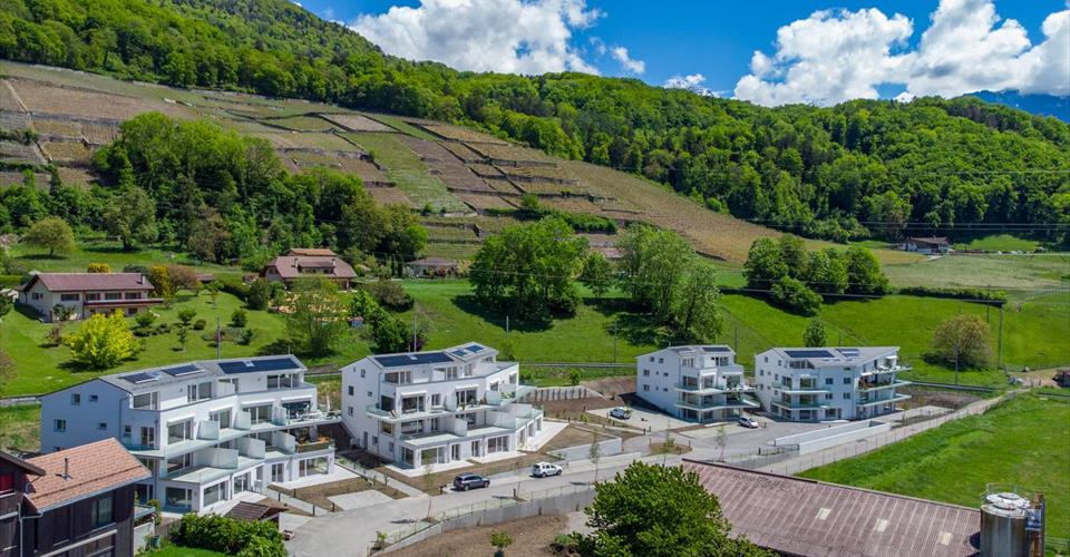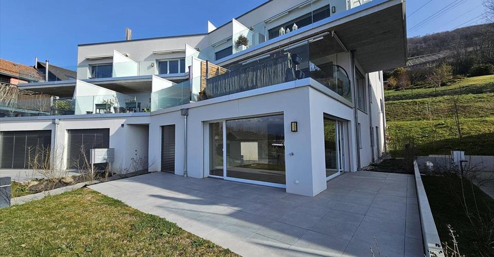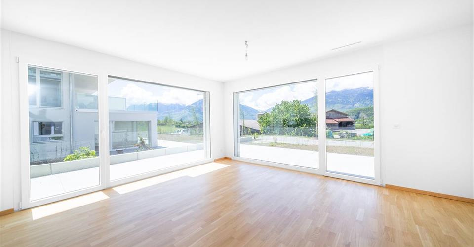 Spacieux et lumineux appartement de 3.5 pièces situé dans la résidence « Les Terrasses du Chablais ». La Résidence « Les Terrasses du Chablais » propose 40 appartements répartis en 4 immeubles allant du studio au 4.5 pièces ainsi que 5 surfaces commerciales le tout desservi par un parking souterrain. Points forts : Ventilation à double flux, stores électriques dans toutes les pièces sauf salles d’eau, colonne de lavage-séchage offerte. Le lot No 102 situé au rez-de-chaussée propose une surface pondérée de 115 m2 avec terrasse de 39 m2 et jardin de 36 m2. Il est composé comme suit : Hall d’entrée avec armoire – Cuisine équipée ouverte – Séjour/salle à manger avec accès à la terrasse – Salle de bains/WC/lavabo avec colonne de lavage-séchage – – Salle de douche/WC/lavabo – Deux chambres dont une avec accès à la terrasse et au jardin Sont également disponibles , des appartements de 2 ½, 3 ½ et 4 ½ pièces ainsi que des surfaces commerciales de 69 m2 à 178 m2. Places de parc extérieures : CHF 15’000.- Places de parc intérieures : CHF 30’000.- Installation d’une borne de recharge électrique possible sur la place de parc Baignée par le soleil, la commune d’Ollon, 6ème du canton en termes de superficie, jouit d’un agréable microclimat. S’étendant du Rhône (alt. 391 m) au Chamossaire (alt. 2’112 m), son paysage est harmonieusement composé de terres agricoles, de vignes, de forêts, de pâturages, de cours d’eau, au milieu desquels 23 villages et hameaux se sont confortablement érigés. Ollon est réputée pour ses grands vins et Villars pour son superbe domaine skiable. Le village est desservi par le train AOMC (Aigle-Ollon-Monthey-Champéry) dont un arrêt se situe à quelques pas de la résidence. La desserte autoroutière quant à elle n’est éloignée que de 2 km. A quelques centaines de mètres se situent les établissements scolaires allant du jardin d’enfants au secondaire. REMARQUE : Cet objet est loué. Il est donc vendu avec reprise du bail.