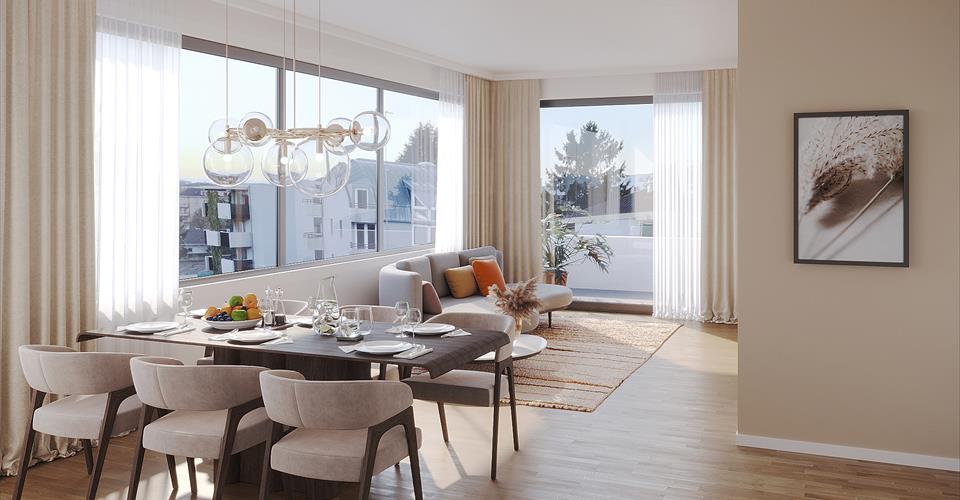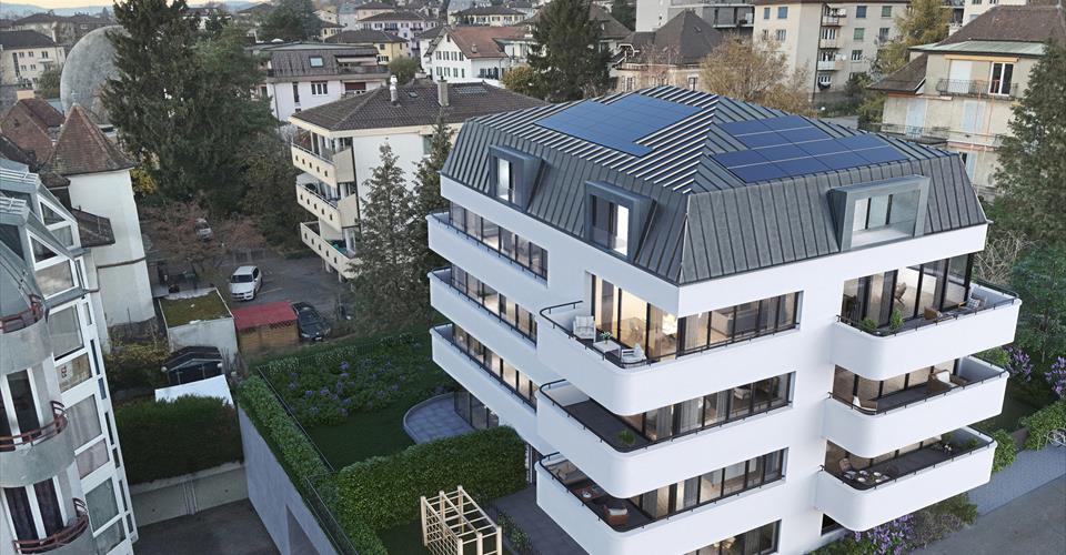 3,5 pièces – 87 m² PPE, dont 83 m² habitables, avec loggia de 8 m² Il ne reste que 2 lots sur 14 ! Nichée dans un cadre paisible et verdoyant à proximité immédiate du centre, cette nouvelle résidence de 14 appartements de standing offre tous les atouts recherchés dans un environnement naturel et privilégié à Renens. La Résidence Hélia propose un cadre de vie exceptionnel pour la région, à quelques pas de toutes les commodités. Aménagés de manière astucieuse pour maximiser l’espace, les appartements se déclinent en 2.5, 3.5 et 4.5 pièces. Leur agencement intérieur crée de véritables espaces de vie agréables au quotidien. Ce projet sur mesure permet aux futurs propriétaires de personnaliser la distribution ainsi que de choisir les équipements, les matériaux et les finitions qui leur conviennent. La Résidence Hélia, réalisée selon les dernières normes Minergie, offre à ses futurs habitants une consommation d’énergie basse et un confort de vie exceptionnel. Le chauffage est assuré par une pompe à chaleur et des panneaux solaires, distribués via un système de chauffage au sol. Parking intérieur pour 3,5 et 4,5 pièces : CHF 45’000 par place. L’immeuble est situé à proximité immédiate du centre de Renens, des supermarchés Coop et Migros et de toutes les commodités. La gare se trouve à seulement quelques minutes à pied, tandis que le centre-ville de Lausanne est accessible en 10 minutes.