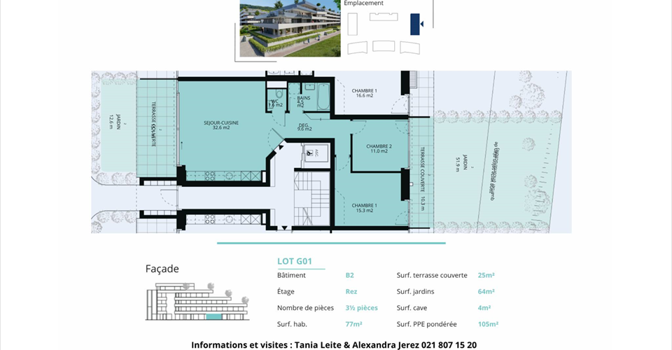 Panorama de rêve ! Faites de l’exceptionnel votre lieu de résidence ! Cet appartement de 3.5 pièces se trouve au rez-de-chaussée du bâtiment B2. Il se compose comme suit : Une entrée avec armoire murale, un séjour / cuisine ouverte de plus de 32m2 avec accès à une première terrasse couverte de 15 m2 et jardin de 12.6 m2, une salle de bain avec arrivées d’eau pour la colonne de lavage, un WC séparé, deux chambres à coucher avec chacune un accès à la deuxième terrasse couverte de 10.3 et jardin de 51.9 m2. Une place de parc intérieure (CHF 55’000.- en sus) ainsi qu’une cave complètent ce bien. Les charges PPE sont estimées pour ce lot à CHF 500.-. LES ATOUTS : – Labélisé Minergie P Eco – Pompe à chaleur à sondes géothermiques – Panneaux photovoltaïque pour une diminution des coûts de votre facture énergétique – Ventilation : système double flux – Thermostat d’ambiance dans toutes les pièces – Construction par l’Entreprise Générale BERNARD NICOD SA LIVRAISON : D1 – D2 = 30.05.2025 D3 = 30.04.2025 B2 = 30.06.2025 B1 Centre = 30.09.2025 B1 Ouest = 31.10.2025 Objets rares à découvrir ! Vue Lac et Mont-blanc à perte de vue. Information et visites : Alexandra JEREZ & Tania LEITE