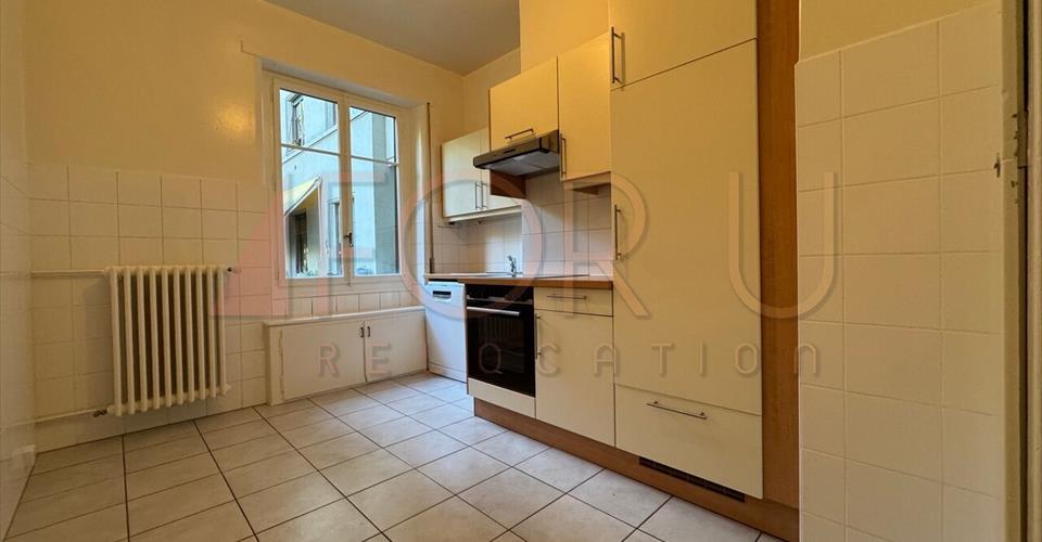 WWW.FORURELOC.COM 3.5 pièces, 1er étage • Appartement traversant et lumineux au calme avec cachet d’env. 88 m² • Rafraîchissement en cours (peintures et parquets) • Beaux parquets et moulures aux plafonds • Salon • Cuisine habitable, agencée et équipée (lave-vaisselle incl.) • Grande et petite chambres • Salle de bain avec branchement lave-linge • WC séparé • 2 balcons • Armoires encastrées dans toutes les pièces • Fibre optique • Vaste cave Visite en vidéo sur le lien suivant: https://youtu.be/Tb68oFAmnAA Loyer: CHF 3’100.– + 160.- (charges) Disponible de suite Conditions de location