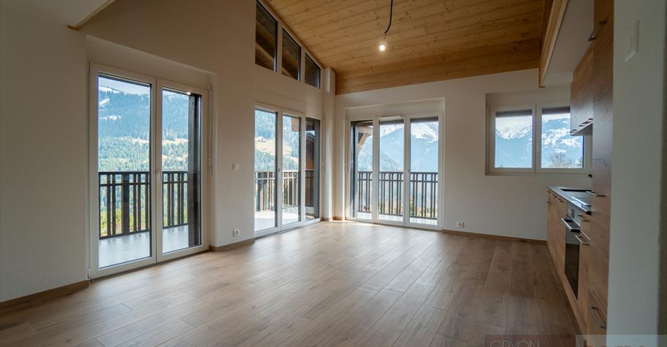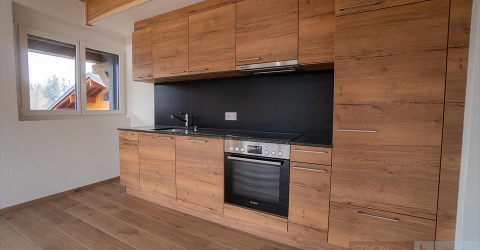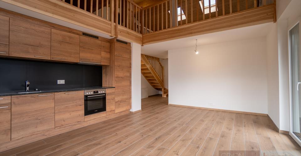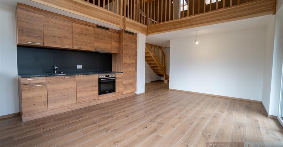 L’appartement se situe au 3ème étage. Distribution: Une entrée Une cuisine ouverte sur un espace repas / séjour Deux chambres dont une sur mezzanine non fermée Deux salles d’eau Un balcon faisant le coin de l’appartement Une cave Une place de parc Informations techniques : Chauffage à pellet Chauffage au sol avec thermostat par pièce Buanderie commune Loyers : entre CHF 2’430.- (charges comprises ). Une place de parc est obligatoire et en sus pour CHF 120.-/mois. N’hésitez pas à nous contacter pour plus de renseignements !