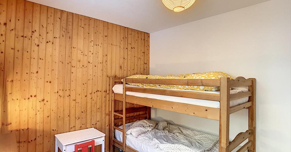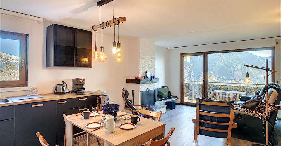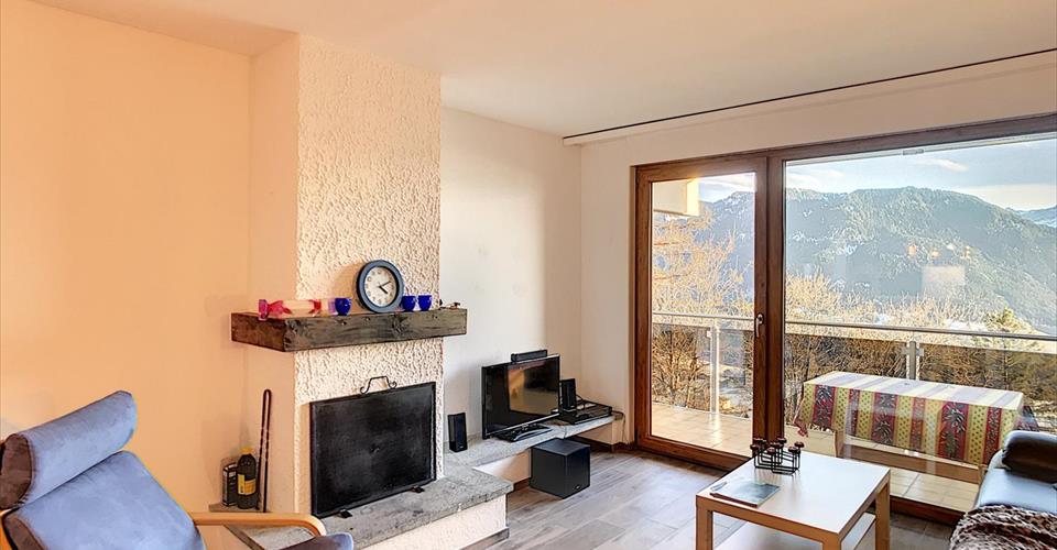 Un séjour avec cheminée décorative, 2 fauteuils et un canapé 3 places, Meublé 1 chambre avec un lit double 1 chambre avec lit à étage Cuisine ouverte entièrement équipée (lave-vaisselle, frigo et plaque à induction.) Balcon orienté sud-ouest Salle de bain à lumière tamisée avec douche à l’italienne 1 place de parc couverte Ascenseur, buanderie commune, local à skis Loyer mensuel 1600 CHF + 150 acompte de charges