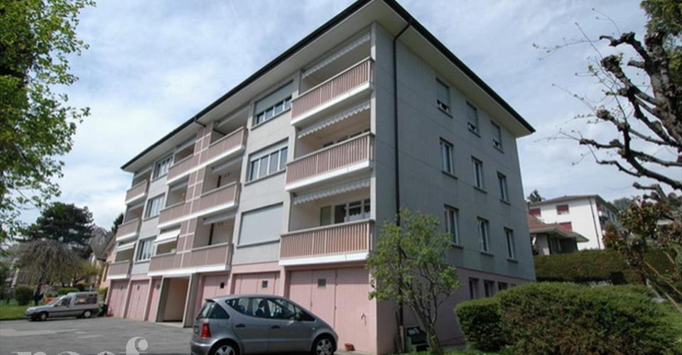 comprenant : hall, cuisine agencée, séjour, deux chambres, salle de bains/WC, WC séparés et balcon. Un garage box est obligatoire à Fr. 200.00/mois en sus.