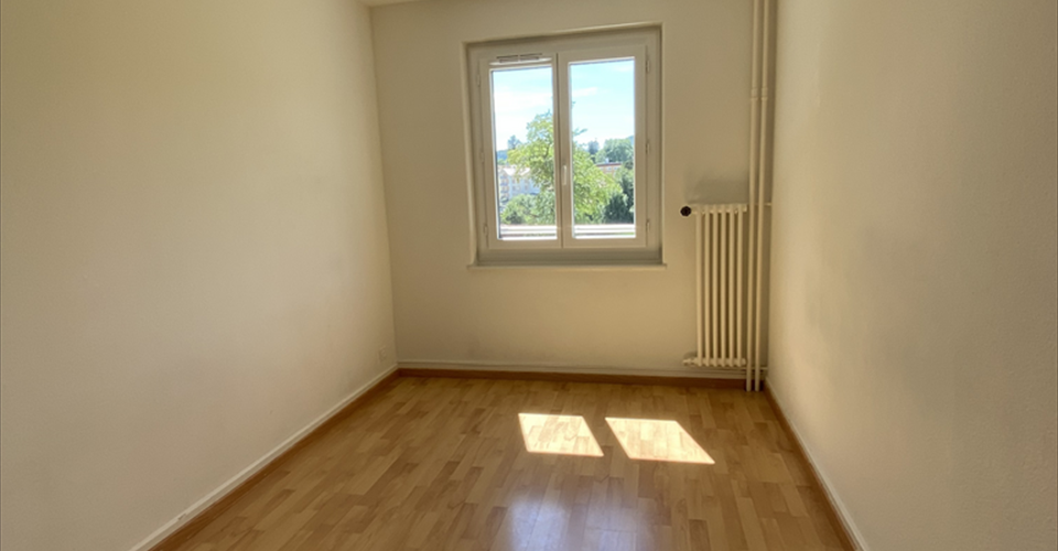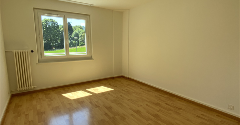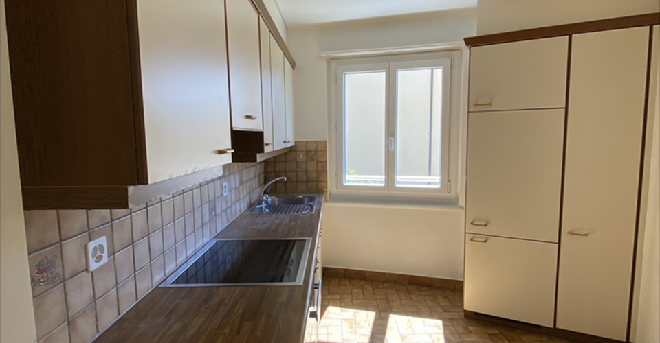 Appartement de 3.5 pièces au rez-de-chaussée comprenant : Grand hall Cuisine agencée habitable Séjour 2 chambres Salle-de-bains / WC Cave Disponible de suite ou à convenir