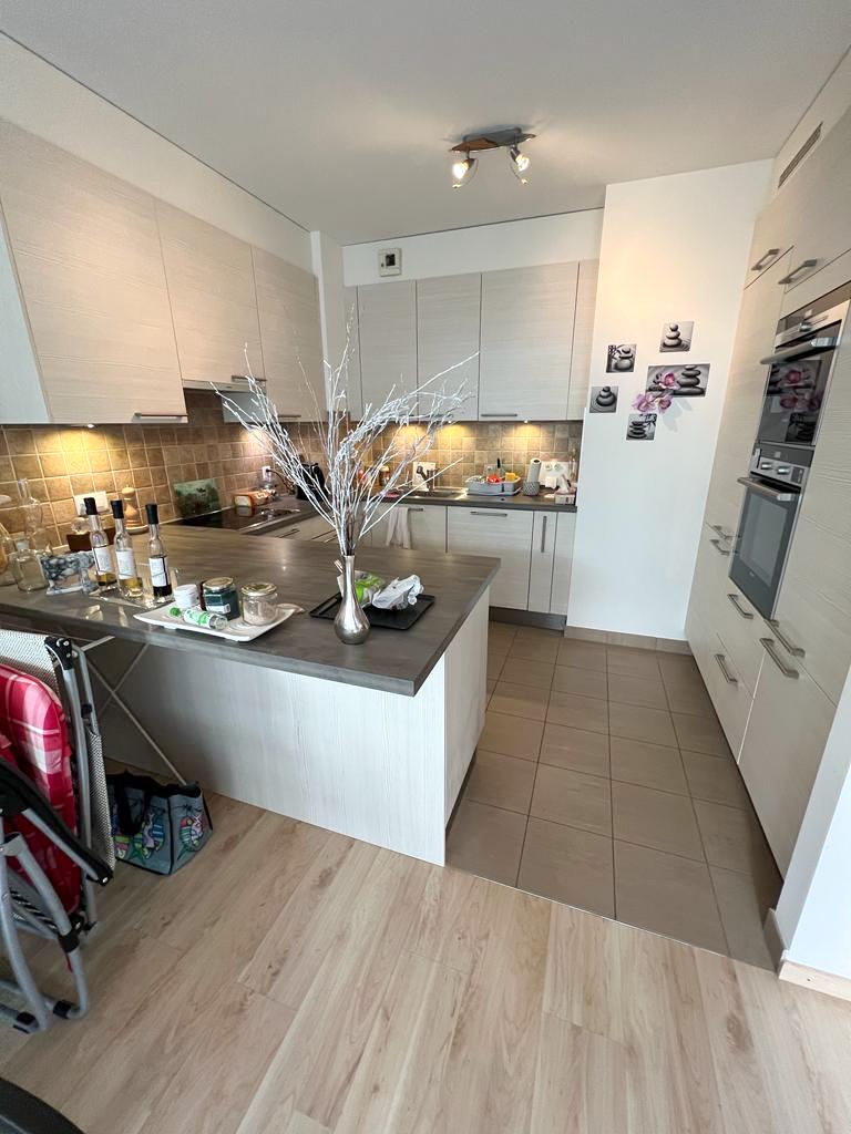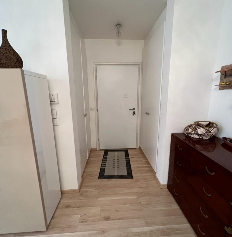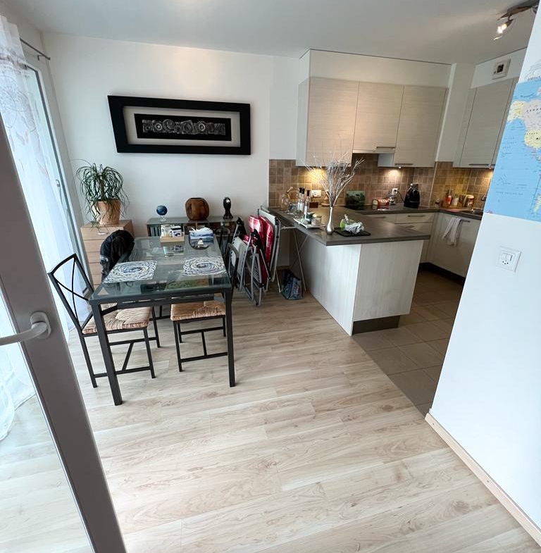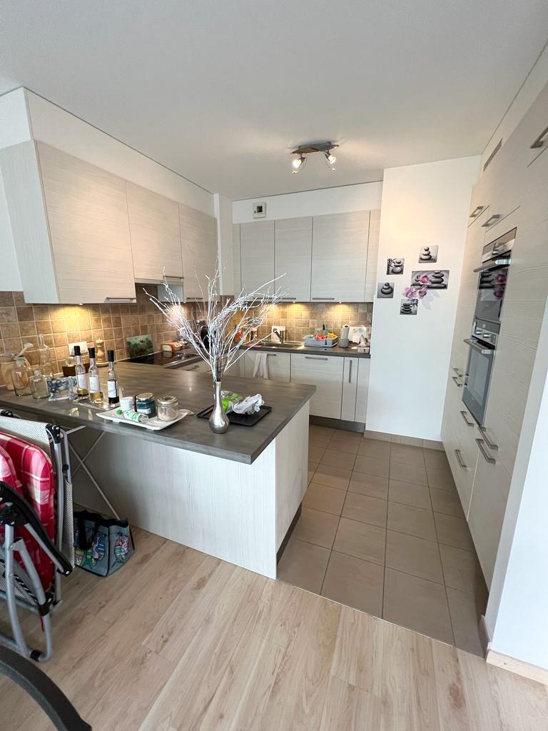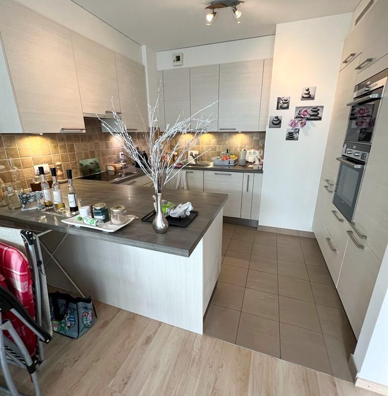 L’appartement est composé d’un hall d’entrée avec armoires, un grand salon, une cuisine ouverte entièrement équipée avec un espace salle à manger.