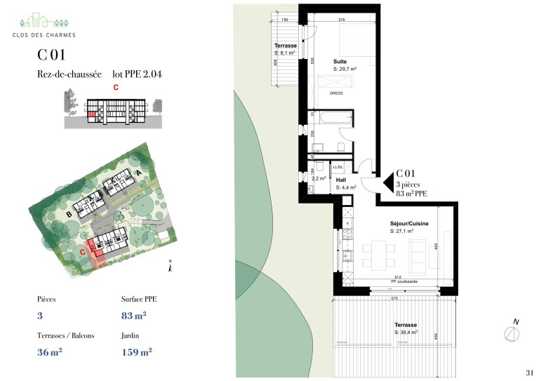 Il propose une propose de généreux et lumineux volumes pour une surface PPE de 83 m², une terrasse de 36 m² et un jardin de 159 m².