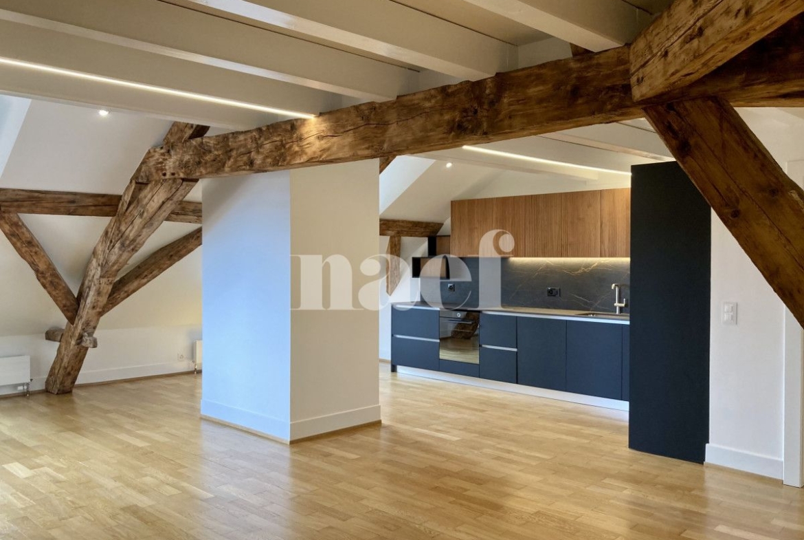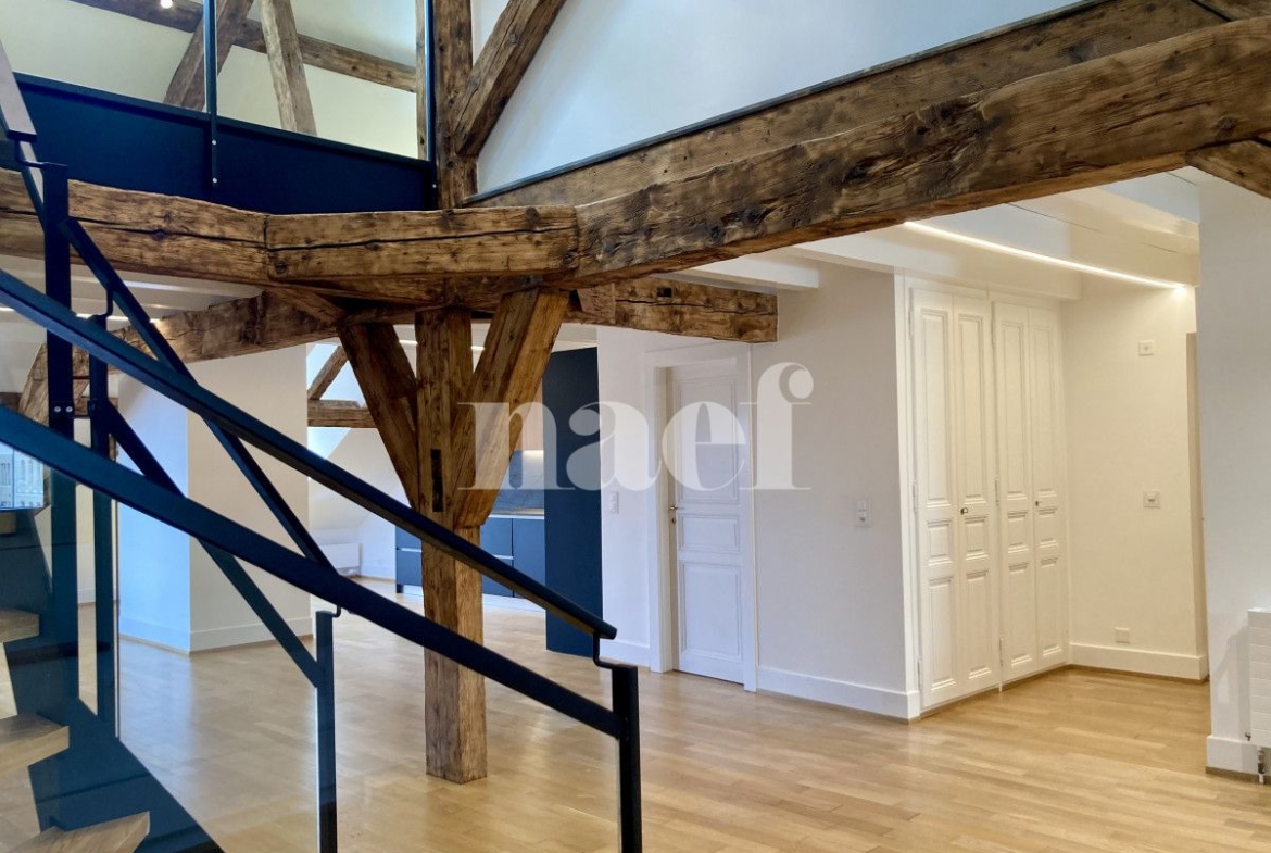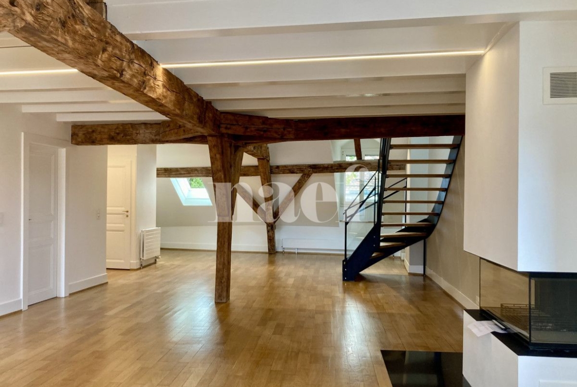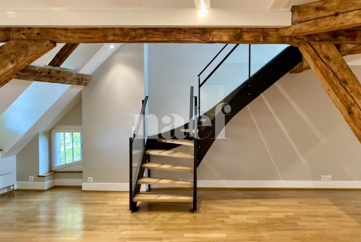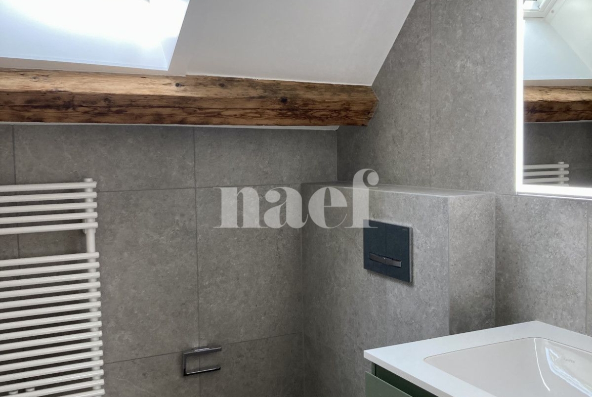 Entièrement rénové avec des matériaux de qualité et des finitions très soignées alliant le charme de l’ancien au confort actuel, il se répartit sur 2 niveaux comme suit : le hall d’entrée dispose d’armoires intégrées, d’un réduit et du système de chauffage individuel à chaque appartement et il s’ouvre sur la généreuse pièce de vie de plus de 50 m². Celle-ci bénéficie de fenêtres sur 3 côtés offrant une vue…