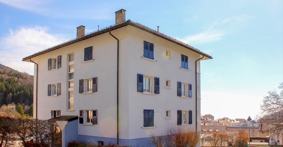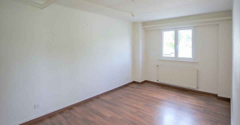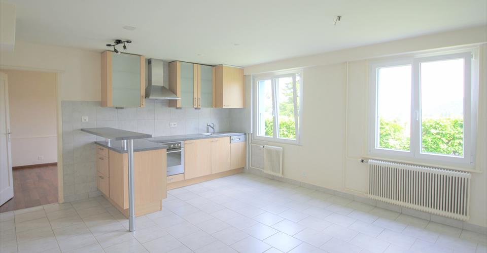 PEINTURES NEUVES EN 2025 – IDEAL POUR PERSONNE SEULE OU COUPLE Appartement de 3 pièces au rez inférieur, d’un immeuble calme de 7 logements. A 10 min. à pied des commerces et de la gare, ce logement d’env. 55 m2 se compose de : Entrée avec armoire murale Cuisine agencée et équipée ouverte sur le séjour 2 chambres Salle d’eau avec douche, lavabo et WC 1 cave 1 galetas Possibilité de louer un garage en sus (CHF 110.-/mois) De plus, une buanderie commune avec lave-linge + séchoir (prépaiement) complète ce bien