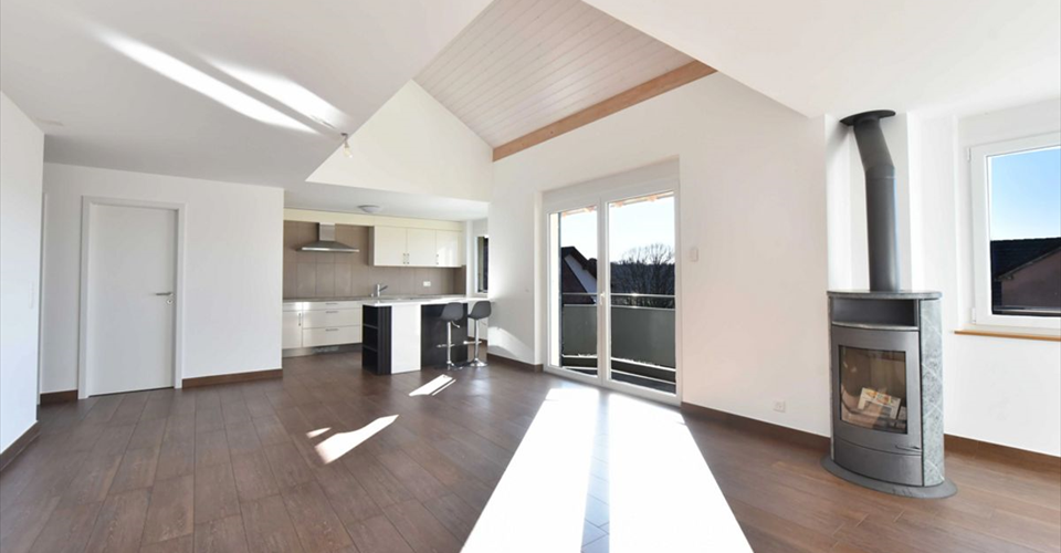 Dans un cadre paisible et verdoyant, ce superbe duplex de 132 m² séduit par sa belle luminosité, ses volumes généreux et son agencement fonctionnel. Situé au dernier étage d’un petit immeuble construit en 2010, il offre un cadre de vie idéal, alliant confort moderne et atmosphère chaleureuse. Disposition : Un vaste séjour traversant, baigné de lumière naturelle, avec cheminée Une cuisine ouverte, moderne et entièrement équipée Deux salles de bains soignées, dont une avec baignoire Deux chambres confortables aux beaux volumes Un balcon de 8 m², parfait pour profiter des beaux jours Atouts supplémentaires : Chauffage au sol central, garantissant un confort optimal Cheminée pour une ambiance cosy en hiver Fenêtres de toit électriques, avec ouverture motorisée et stores extérieurs intégrés Deux places de parc extérieures Une cave Une buanderie avec colonne de lavage et de séchage Charges mensuelles maîtrisées Bien disponible immédiatement Emplacement privilégié : À seulement quelques minutes des principaux axes routiers et des commodités, ce duplex bénéficie d’une situation idéale. Vous profitez à la fois du calme d’un environnement villageois et de la proximité des écoles, commerces, gare et autoroute. Pour organiser une visite ou recevoir davantage d’informations, n’hésitez pas à nous contacter.
