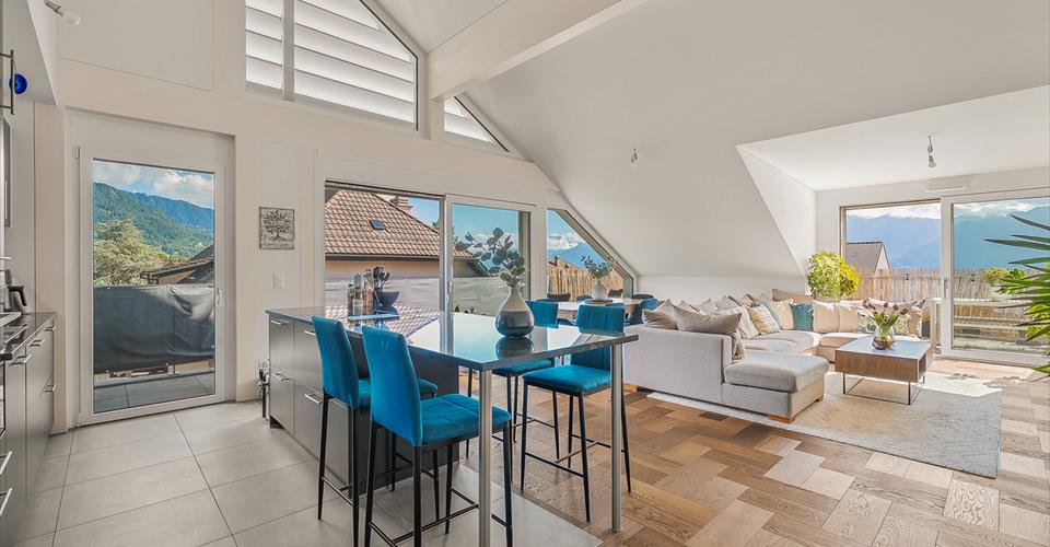 Au calme, entourés par un écrin de verdure, en retrait du bruit ambiant, l’appartement profite d’un environnement paisible. Dans son style parfaitement contemporain, cet appartement offre un magnifique dégagement sur le lac Léman et les Alpes. Les baies vitrées et les grandes ouvertures permettent d’illuminer les intérieurs d’une douce lumière avec une orientation su/sud-ouest. La terrasse de 44 m2 entourant le logement ajoute la touche d’extérieur, si nécessaire à nos vies quotidiennes. Ce logement est constitué d’un vaste séjour “tout hauteur, une cuisine parfaitement équipée avec des appareils ménagés de standing, la terrasse de 44m2 entoure le logement et permets ainsi de profiter de plusieurs point de vue, sur le lac ou sur les Pléiades et la Dent-de-Jaman, enfin une belle chambre principale avec salle de bains en suite, puis de chambres de bonnes tailles se partage une salle de douche. Deux places de parc intérieurs et une cave complètent ce logement.