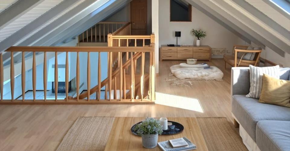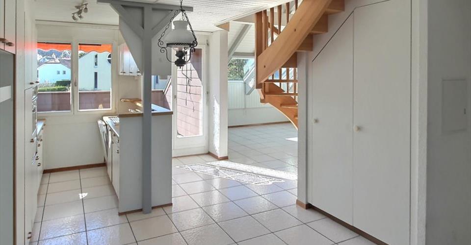 – en exclusivité chez Demace Immobilier – Situé au dernier étage (combles et sur-combles) d’un petit immeuble résidentiel, dans un quartier calme et verdoyant tout en restant proche des commodités, cet appartement de 4.5 pièces offre un cadre de vie idéal pour une famille à la recherche de confort et de tranquillité. Comptant actuellement deux chambres à coucher fermées, une troisième chambre pourra très facilement être créee en érigeant un mur supplémentaire avec porte. Se trouvant au dessus du niveau principal, la galerie supérieure de 24 m² env., ouverte sur le salon, constitue un véritable espace de vie supplémentaire pouvant accueillir un coin télévision ou un espace jeux ou bureau par exemple. Bien que parfaitement habitable immédiatement, certains travaux de rénovation/remise au goût du jour pourront être planifiés par les nouveaux propriétaires, notamment en ce qui concerne la cuisine et les pièces d’eau. En raison de son éloignement des axes routiers importants, c’est une situation idéale pour les enfants, notamment en raison de l’ environnement protégé et des espaces de verdure extérieurs. L’exposition ouest du balcon garantit un bon ensoleillement, permettant ainsi de profiter agréablement des fin de journées. Disponibilité: de suite ou à convenir N’hésitez pas à nous contacter pour en savoir plus ou pour une découverte des lieux ! ou info at demace-immobilier.ch
