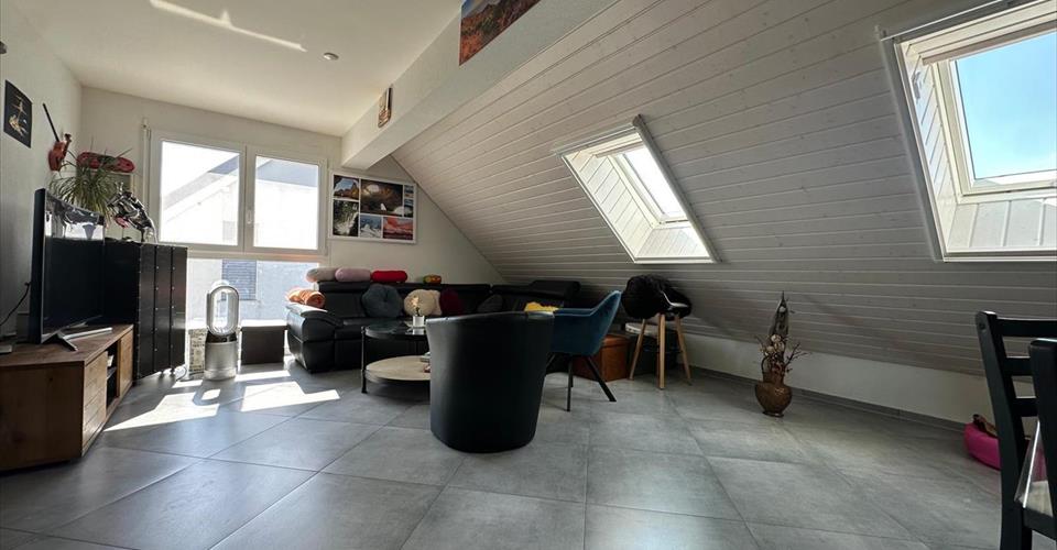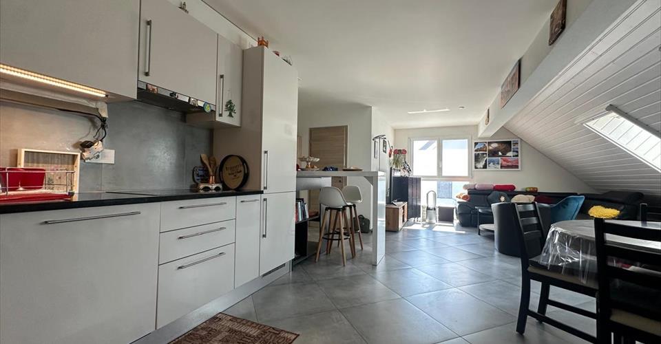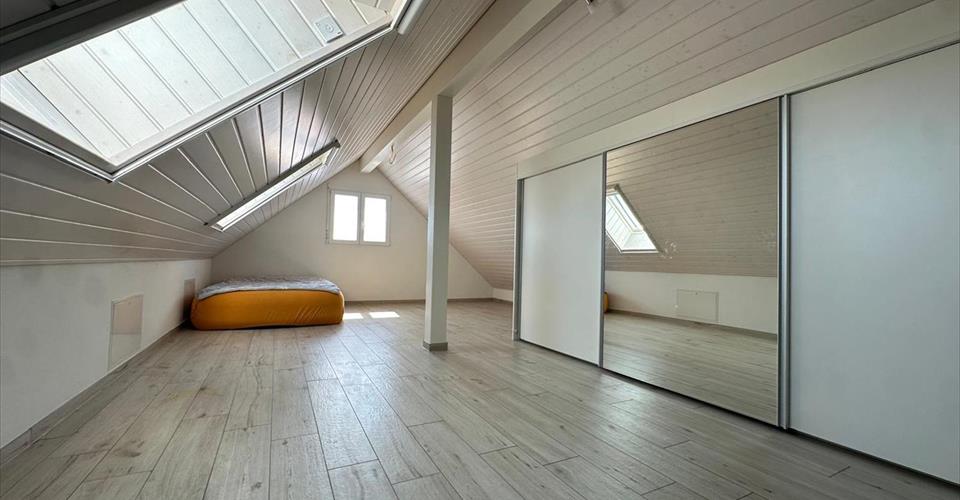 Situé en bordure de zone agricole et à l’abri de toute nuisance, cet appartement récemment livré en 2018 offre une cadre de vie plaisant à proximité des commodités dans un immeuble composé de seulement six logements. Il se distingue notamment par ses finitions soignées et de qualité. Il bénéficie également d’une orientation plein sud-ouest qui lui confère une belle luminosité. En plus de sa grande pièce de 37 m2 dans les surcombles considérée en surface utile et ceci bien qu’elle réponde en tous points aux exigences d’une surface habitable, il dispose également d’un balcon-baignoire de 12 m2 sans vis-à-vis direct. Au sous-sol une cave de près de 30 m2 pourrait être aménagée en carnotzet ou salle loisirs. Ce bien est proposé avec sa place de parc intérieure et extérieure au prix additionnel de Frs 60’000.–