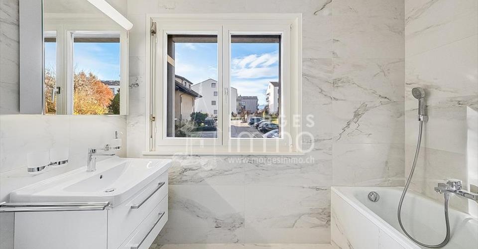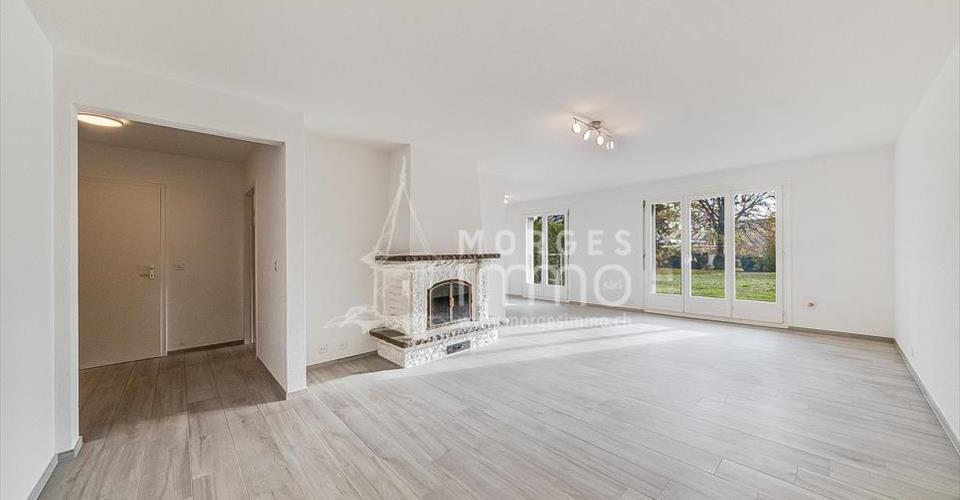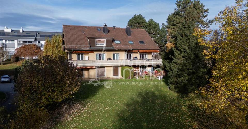 Bel appartement rénové de 4.5 pièces en rez-de-chaussée supérieur avec terrasse privative orientée Ouest, bénéficiant d’une situation calme et agréable. Il est situé dans une petite PPE de 6 logements très bien entretenue. Partie jour: Hall d’entrée avec interphone, salle d’eau avec douche, lavabo, cuisine agencée ouverte sur espace séjour salle à manger agrémenté d’une belle cheminée et accès sur une terrasse orientée Ouest. Partie nuit: Hall de dégagement avec armoires intégrées, chambre à coucher orientée Nord-Est, chambre à coucher orientée Ouest, chambre orientée Sud avec accès sur la terrasse, salle d’eau avec bain, wc, lavabo et fenêtre. Sous-sol: Grande cave Espace buanderie commune Extérieur: Garage box individuel avec porte automatique en sus du prix à CHF 40’000.00 Place de parc extérieure n° 6, en servitude en sus du prix à CHF 15’000.00