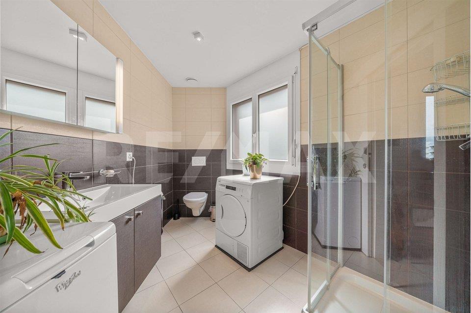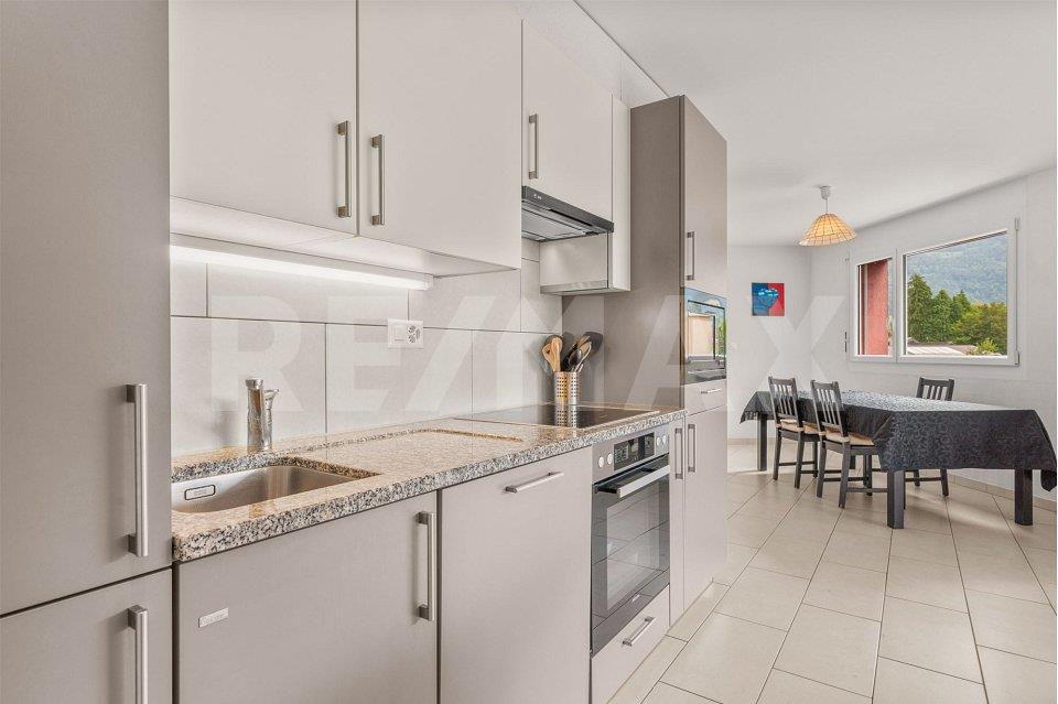 Dans une résidence récente construite en 2014 proche de toutes les commodités, ce spacieux appartement familial de 4.5 pièces est situé au 3ème étage (avec ascenseur) de limmeuble. Offrant une confortable surface habitable de 104 m² (surface pondérée de 111 m²), il bénéficie de grands espaces de vie largement ouverts sur lextérieur grâce à une configuration atypique en triangle (voir plan pages 16-17). Toutes les pièces profitent ainsi dune belle luminosité à laquelle sajoutent des aménagements et des finitions clairs et contemporains. Leur distribution est très fonctionnelle et contribue à une vie confortable et agréable. Limpression despace et douverture est accentuée par un grand balcon de 12 m² offrant une vue dégagée sur la paysage environnant. Le lot est composé également de: – une cave – 2 places de parc dans le garage souterrain (vendues en sus 30’000.-/place) Un objet situé dans une région dynamique proche de tout. – Dans une résidence récente construite en 2014 proche de toutes les commodités, ce spacieux appartement familial de 4.5 pièces est situé au 3ème étage (avec ascenseur) de limmeuble. Offrant une confortable surface habitable de 104 m² (surface pondérée de 111 m²), il bénéficie de grands espaces de vie largement ouverts sur lextérieur grâce à une configuration atypique en triangle (voir plan pages 16-17). Toutes les pièces profitent ainsi dune belle luminosité à laquelle sajoutent des aménagements et des finitions clairs et contemporains. Leur distribution est très fonctionnelle et contribue à une vie confortable et agréable. Limpression despace et douverture est accentuée par un grand balcon de 12 m² offrant une vue dégagée sur la paysage environnant. Le lot est composé également de: – une cave – 2 places de parc dans le garage souterrain (vendues en sus 30’000.-/place) Un objet situé dans une région dynamique proche de tout.