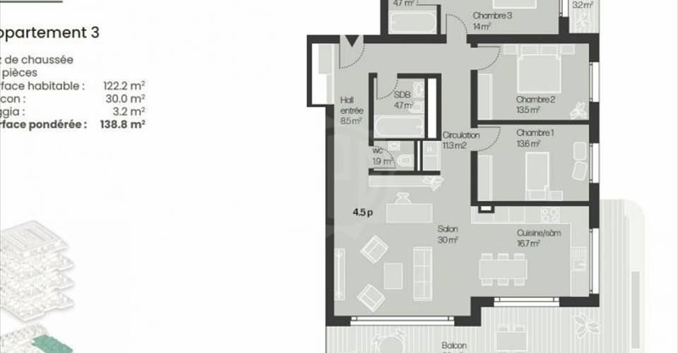 SPG a le plaisir de vous présenter en exclusivité ce splendide appartement de 4.5 pièces au rez-de-chaussée. L’appartement, orienté sud-est, offre une surface PPE de 138.8 m2 et un vaste balcon de 30 m2 ainsi qu’une loggia de 3.2 m2. o Label Minergie P-Eco o Un cadre de vie sain et durable o Livraison prévue début 2027 Découvrez la promotion d’appartements de 3.5 à 5.5 pièces “BEAUMONT” https://beaumont-lausanne.ch/ et réalisez votre rêve d’acquérir un appartement de grande qualité, idéalement situé dans un quartier connecté, agréable et paisible ! Contactez notre équipe de vente dès maintenant,