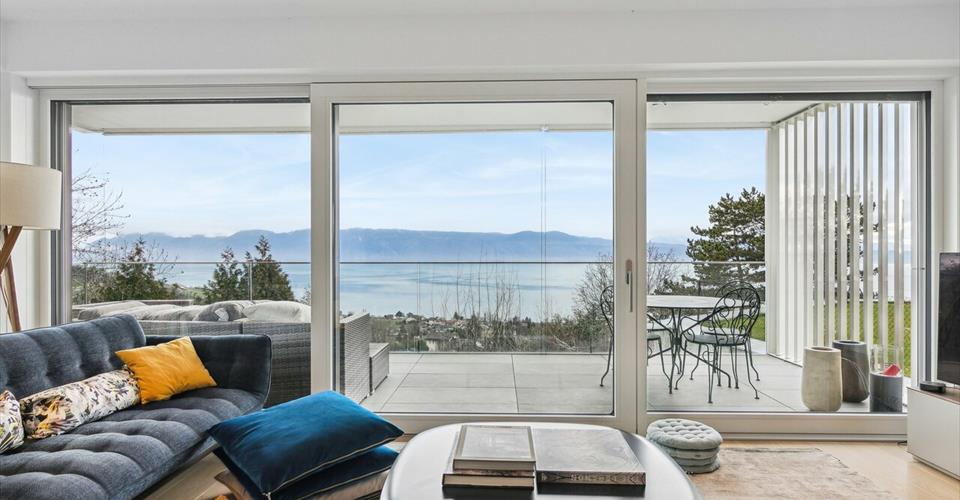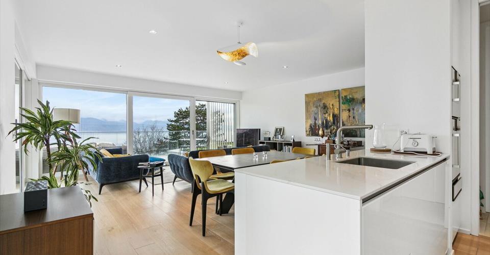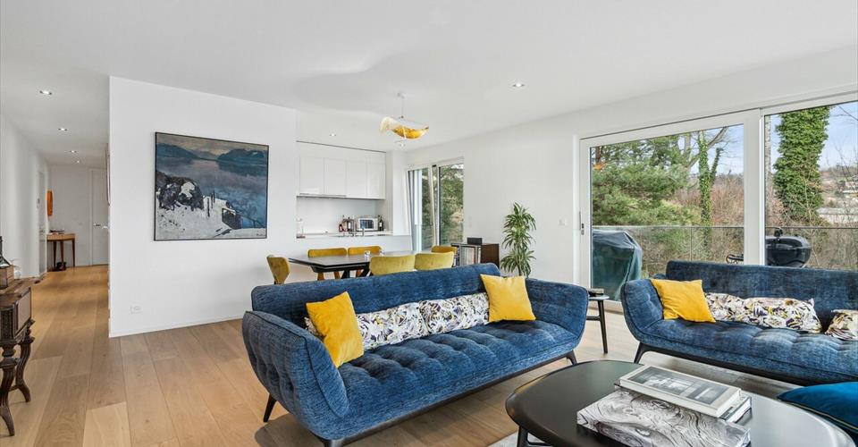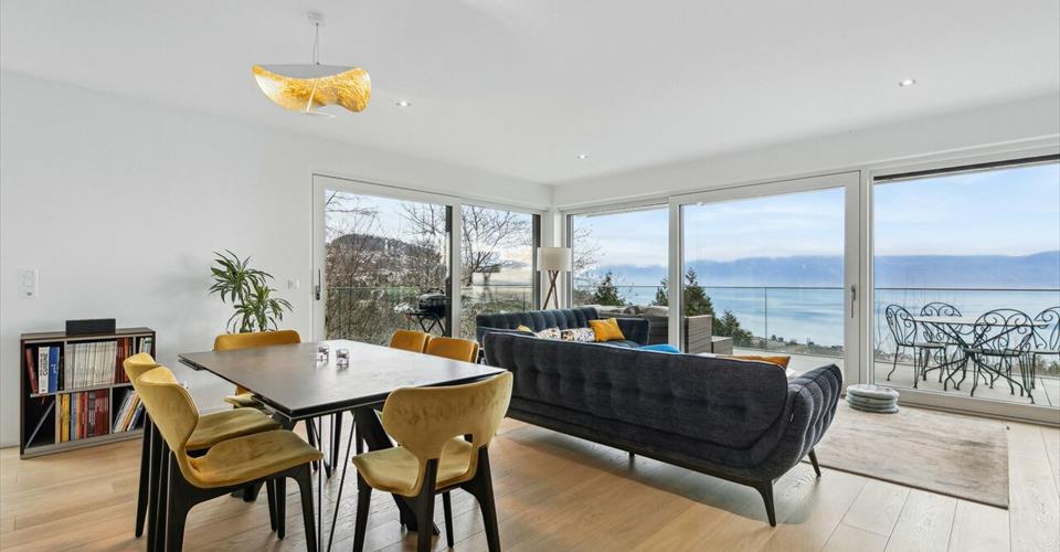 Immeuble très bien situé dans les hauteurs de Lutry, sous l’autoroute, proche des écoles, transports publics, dans un quartier calme et résidentiel. Bénéficie d’une vue magnifique sur le lac et les montagnes. Appartement de 4,5 pièces dans un immeuble moderne, de haut standing, construit en 2020 et signé Rossi. L’appartement, sis au rez-de-chaussée est distribué comme suit : – Entrée avec placards de rangement – Toilette visiteurs – Cuisine ouverte sur le salon/salle à manger avec accès sur le balcon/terrasse de 24m² – Coin buanderie – 2 chambres à coucher avec armoires encastrées et une salle de bains en commun – 1 chambre parentale avec salle de bains en suite et armoires encastrées – 1 grande cave – 1 place de parking intérieure en sus au prix de CHF 40’000.- Appartement actuellement loué CHF 3’980.-/mois charges comprises. Départ du locataire fin juin 2026.