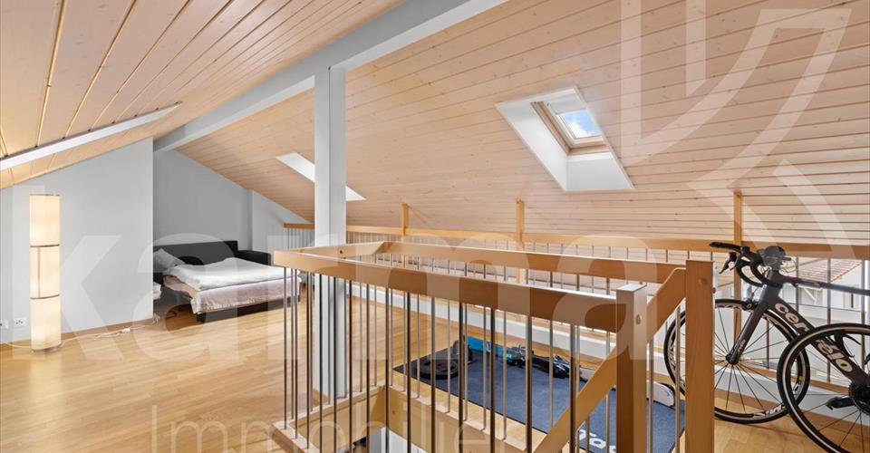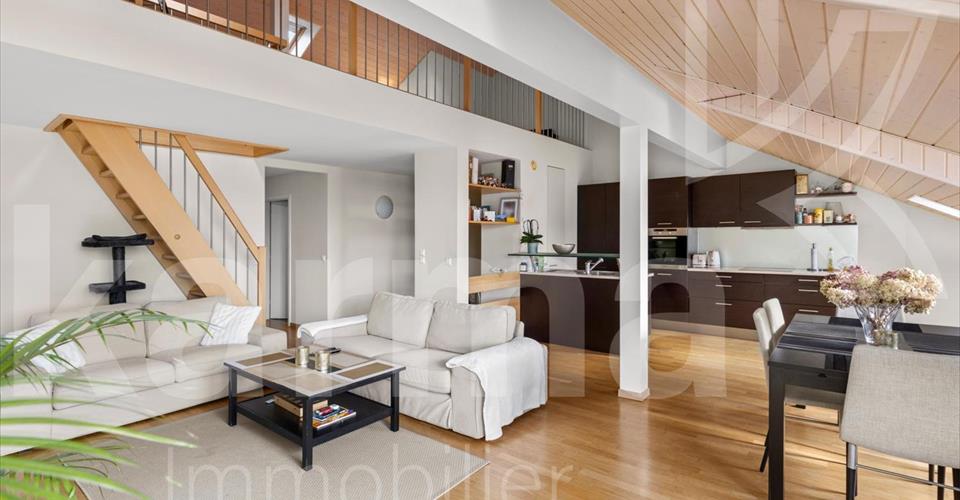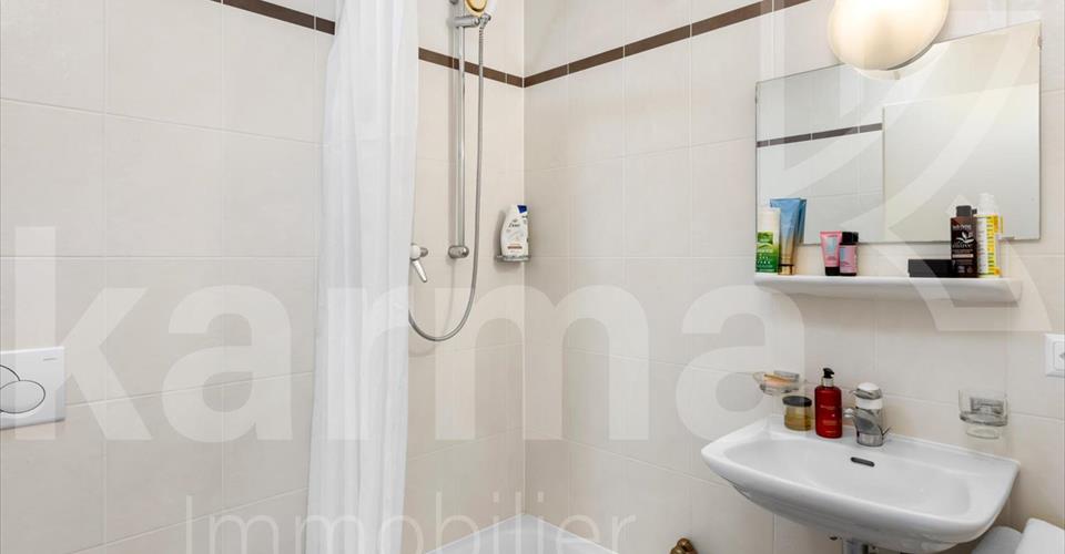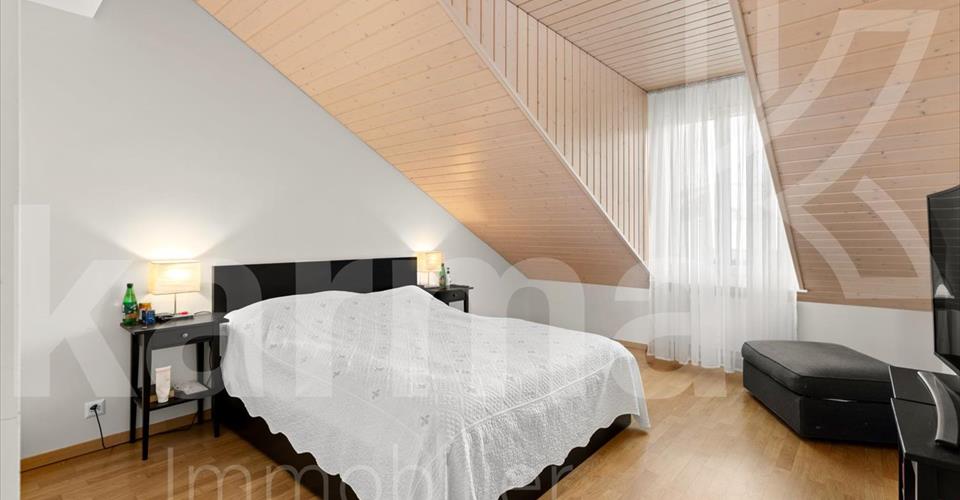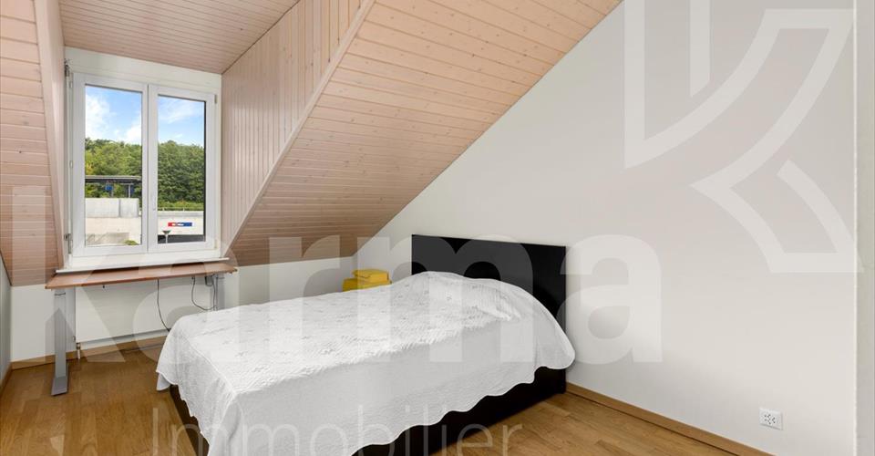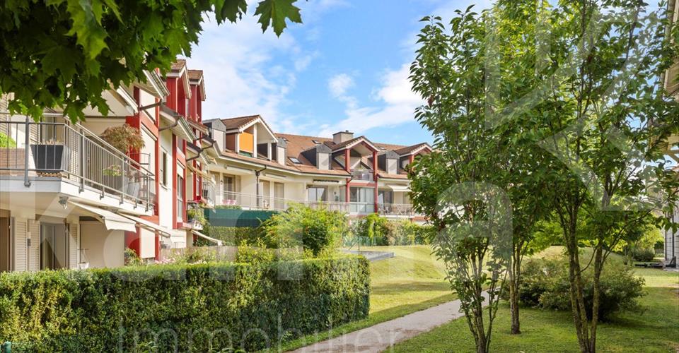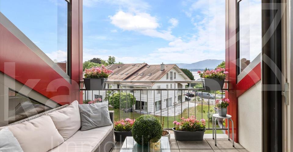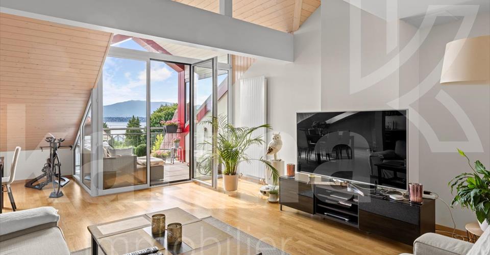 Situé dans le charmant village de Mies à seulement quelques minutes des transports publiques et des écoles publics et privées, ce magnifique appartement en attique offre une belle vue dégagée sur le lac et les Alpes. La partie jour bénéficie d’une belle entrée avec armoires et coin bureau, d’une cuisine ouverte sur la salle à manger et le salon donnant accès directement à l’agréable balcon couvert avec vue sur le lac. La partie nuit quant à elle offre 2 belles chambres à coucher avec armoires, une salle de douche avec un puit de lumière naturel et une salle de bains avec espace buanderie. Les combles sont aménagés et composés d’une salle de douche avec WC et d’un bel espace que vous pourrez adapter selon vos envies en chambres d’amis, bureau etc. Une spacieuse cave, ainsi que 2 places de parc intérieures complètent à merveille ce magnifique attique. Places de parc en sus total : CHF 80’000.-