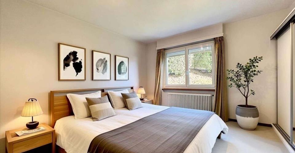 Situé à Clarens, dans l’un des plus beaux quartiers résidentiels, dans un cadre idyllique entouré de verdure et à quelques minutes du bord du lac Léman, des transports publics ainsi que de toutes les commodités, cet appartement de 4,5 pièces jouit d’une très belle vue sur le lac Léman et les montagnes. Il bénéficie d’environ 103 m² habitables avec un balcon d’environ 17,50 m² portant ainsi la surface pondérée à 112 m² . Rénové en 2014, il est en très bon état d’entretien car a été très bien entretenu au fil des ans. Voici sa distribution intérieure : – Un hall d’entrée avec armoires murales ; – Un espace avec colonnes lavage buanderie ; – Deux salles de douche/WC ; – Une cuisine agencée ; – Un vaste séjour/salle à manger avec accès sur le balcon ; – 3 chambres à coucher. A noter que la PPE est régulièrement et très bien entretenue. Possibilité d’un garage box double.