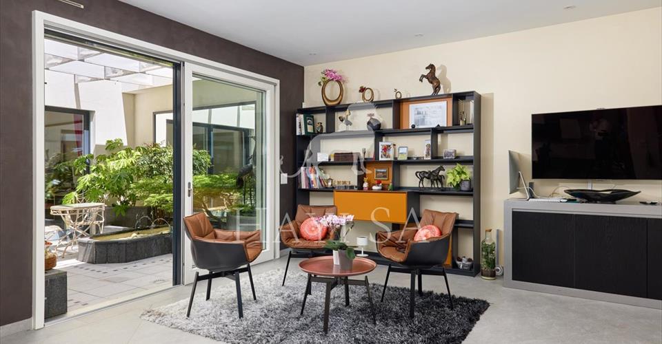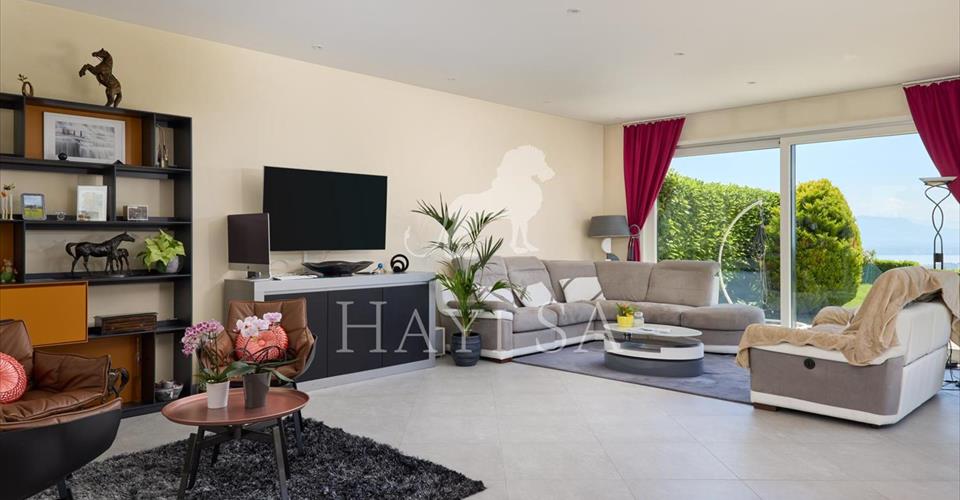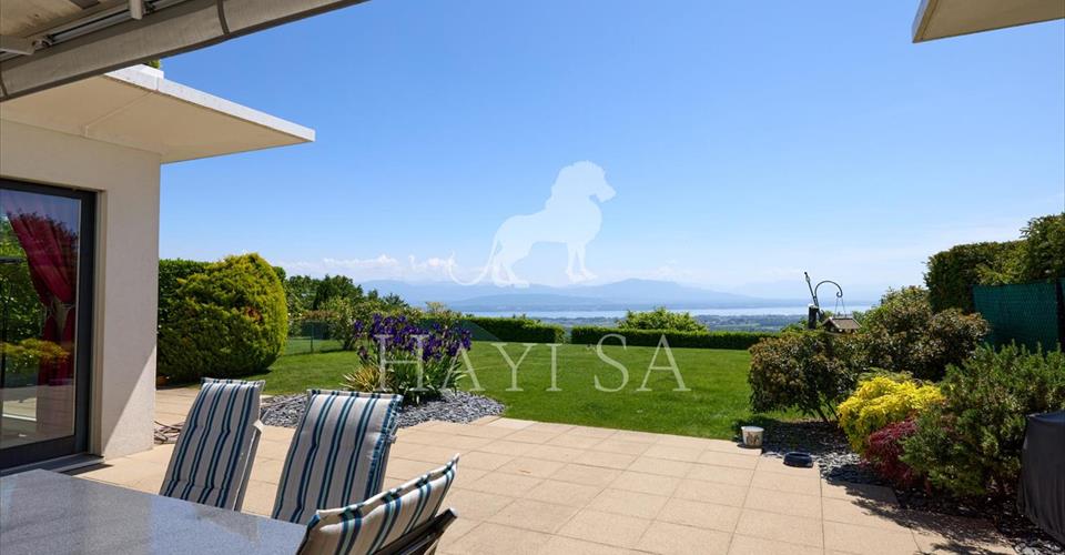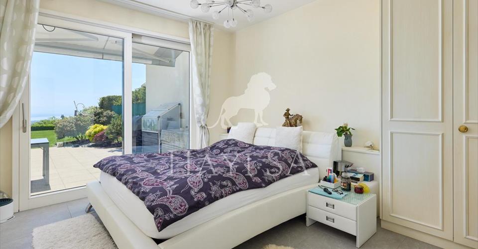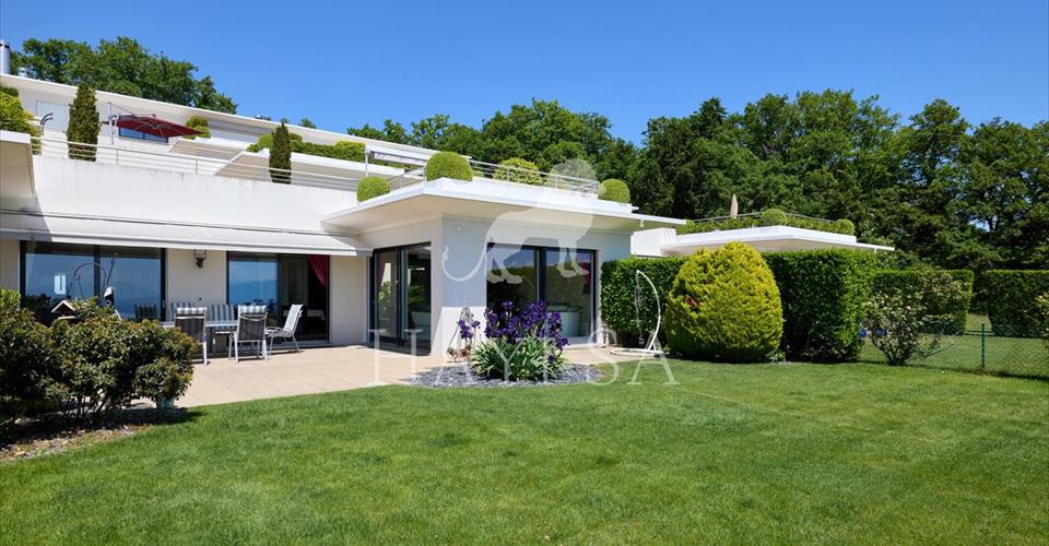 Appartement de standing idéalement situé dans un quartier calme et très prisé, avec vue dominante sur le lac et les Alpes. Entrée sécurisée, barrière d’accès et portail automatique. Distribution actuelle Bel hall d’entré rejoignant des espaces lumineux dont le coin à manger, la cuisine, le patio et le séjour ouvert par de grandes baies vitrées au jardin. La cuisine et son accès au patio, peuvent-être à souhait ouvert ou fermé sur le séjour. Le patio, agréablement aménagé, est centralisé sur un une chambre, la cuisine et le séjour. La chambre parentale avec dressing et salle de bains offre quant à elle un accès direct sur la terrasse. Un bureau est aménagé dans l’une des pièces à l’entrée. Une cave à vins climatisée, une buanderie privée, des espaces de rangement et deux box doubles permettant de garer 4 à 6 voitures au total. Ce bien d’exception est au bénéfice d’un accès privilégié et direct aux services de la renommée clinique de Genolier. Charges 1’050.-/mois Impôt communal 0.55%