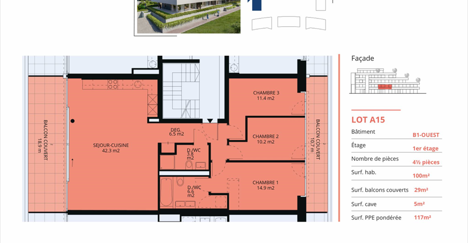 EN EXCLUSIVITE CHEZ BERNARD NICOD ! Cet appartement de 4.5 pièces se trouve au premier étage et se compose comme suit : Un hall d’entrée, un séjour / cuisine ouverte de plus de 42m2 donnant accès à un balcon couvert. Une salle de douche, deux chambres à coucher et une chambre parentale avec salle de bain attenante avec arrivées d’eau pour la colonne de lavage. Les trois chambres donnent accès à un second balcon couvert. Une cave et deux places de parc intérieures (55’000.- par unité en sus) complètent ce bien. LES ATOUTS : – Labélisé Minergie P Eco – Pompe à chaleur à sondes géothermiques – Panneaux photovoltaïque pour une diminution des coûts de votre facture énergétique – Ventilation : système double flux – Thermostat d’ambiance dans toutes les pièces – Construction par l’Entreprise Générale BERNARD NICOD SA Information et visites : Alexandra JEREZ & Tania LEITE
