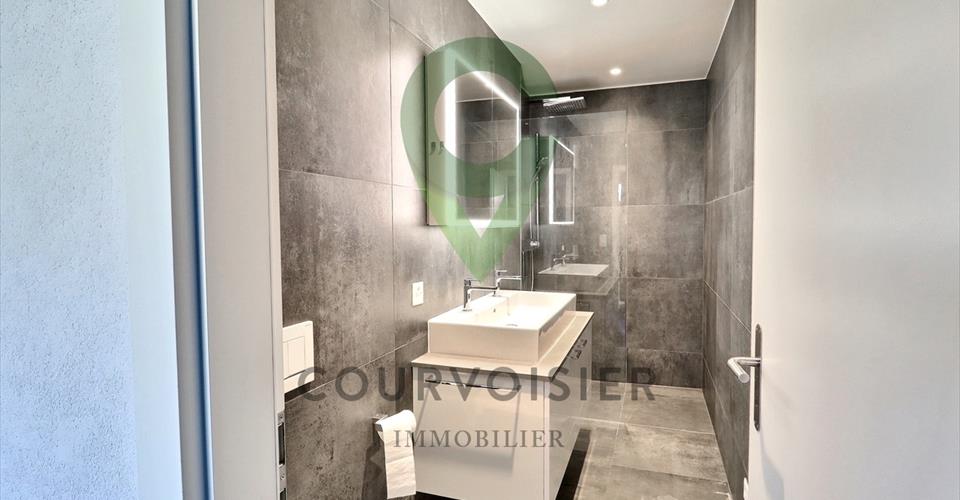 Au cœur de la prisée commune de St-Prex, Courvoisier Immobilier a le plaisir de vous présenter ce splendide appartement au rez-de-chaussée d’une PPE moderne, construite en 2019. Située dans une résidence intimiste composée de 3 immeubles abritant chacun 3 appartements, cette propriété jouit d’un emplacement exceptionnel. À proximité immédiate des commerces, des transports en commun et des écoles, elle constitue un lieu de vie parfait pour une jeune famille ou un couple. Avec ses espaces généreux, sa luminosité optimale et ses prestations de qualité, ce bien allie confort moderne et cadre de vie contemporain. D’une surface habitable de 110 m2, il se prolonge par de beaux espaces extérieurs comprenant une grande terrasse de 60 m2 et un jardin de 522 m2 et se distribue comme suit : Une accueillante entrée, accessible depuis le sous-sol par un ascenseur privé Un spacieux séjour, baigné de lumière, avec une cuisine entièrement équipée ouverte sur un espace dînatoire et un salon. La pièce donne accès à la superbe terrasse, offrant ainsi un espace convivial pour se détendre ou recevoir et prolongeant ainsi harmonieusement l’espace de vie. Une suite parentale avec une salle d’eau attenante (douche et double lavabo) Un dressing indépendant Deux chambres supplémentaires dont une proche d’un réduit aménagé (armoires encastrées) et l’autre bénéficiant d’un accès à la terrasse Une deuxième salle de bains (baignoire, WC, lavabo) Deux places de parc intérieures complètent les prestations de ce bien (en sus.). Alliant modernité, confort et proximité avec les commodités, cet appartement est une opportunité unique à ne pas manquer. Contactez-nous dès aujourd’hui pour organiser une visite.