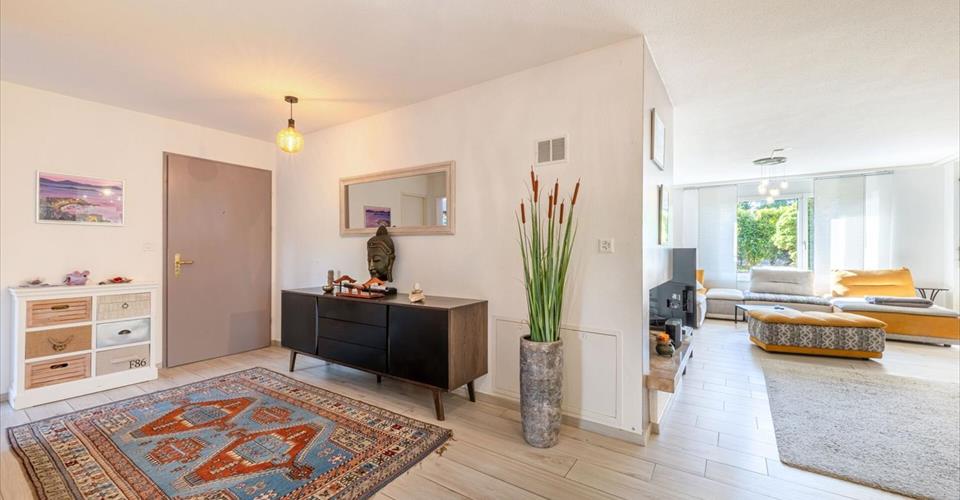 Situé au rez-de-chaussée d’un petit immeuble dans un environnement calme et verdoyant, ce superbe appartement de 4.5 pièces offre un cadre de vie idéal pour les familles. D’une surface généreuse, il se compose d’un vaste salon avec cheminée, d’un espace salle à manger lumineux, de trois chambres à coucher confortables, ainsi que de deux salles de bains avec douches. La cuisine, moderne et fonctionnelle, s’intègre harmonieusement à la disposition du logement. L’un des principaux atouts de ce bien est son jardin privatif de 310 m², véritable écrin de verdure, ainsi que sa spacieuse terrasse de 35 m², parfaite pour les moments de détente ou les repas en plein air. En annexe, l’appartement dispose de deux places de parc intérieures avec bornes de recharge pour véhicules électriques, ainsi que d’une cave. La situation est idéale : à proximité immédiate des écoles, des transports publics et de toutes les commodités, tout en bénéficiant d’un cadre paisible et résidentiel.