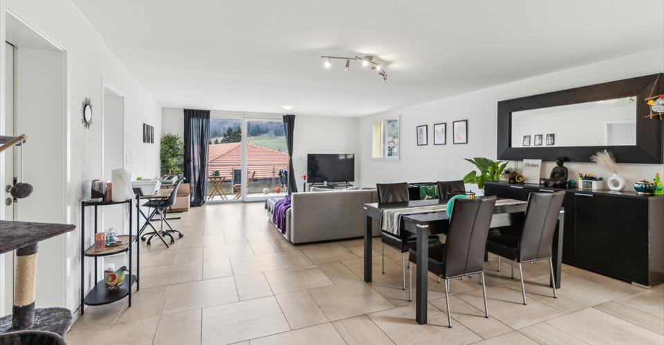 Situé au premier étage d’une résidence moderne construite au sein d’un quartier calme et agréable du village, cet appartement de 4,5 pièces actuellement loué est en excellent état et offre un confort de vie optimal. D’une surface habitable d’environ 115m2, cet appartement dispose d’un espace de vie spacieux et fonctionnel. Il se compose d’une entrée donnant sur le salon/séjour, une cuisine ouverte aménagée et équipée, de 3 chambres et deux salles-de-bains avec WC. Profitez également d’un accès à un grand balcon d’environ 15m2, exposé Sud-Ouest et offrant un superbe point de vue sur les montagnes environnantes. Une place de parc intérieure (en sus) ainsi qu’une cave complètent ce bien. – Etat locatif hors charges de CHF 18’960.-/ an – Charges annuelles : CHF 1’800.-/ an – Total : CHF 20’760.-/ an