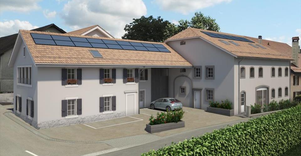 Découvrez ce charmant appartement en duplex, situé à l’étages et combles d’une ferme entièrement rénovée. Offrant un parfait mélange de charme ancien et de confort moderne, cet appartement saura vous séduire dès le premier regard. Situé au 1er étage et dans les combles d’une magnifique ferme entièrement rénovée, cet appartement en duplex allie caractère, luminosité et beaux volumes. Dès l’entrée, on découvre un espace de vie accueillant, avec la possibilité d’y aménager une cuisine ouverte sur le séjour. Une grande baie vitrée prolonge cet espace vers l’extérieur, donnant accès à un balcon offrant une vue apaisante sur les jardins et la zone agricole environnante. Ce niveau comprend également un WC visiteurs et une suite parentale avec sa salle de bain privative. Celle-ci bénéficie d’un accès à une galerie privée, idéale pour y créer un dressing ou un espace de lecture intime. Au coeur de l’appartement, un bel escalier apparent mène aux combles, qui offrent un volume généreux et une grande flexibilité d’aménagement : il est possible d’y créer deux chambres, avec la possibilité de mezzanines, ainsi qu’une salle de bain complémentaire. Ce niveau propose aussi un espace bureau ou coin jeu, ainsi qu’un balcon baignoire, parfait pour profiter du calme. Ce duplex unique en son genre est idéal pour ceux qui recherchent un cadre de vie paisible, tout en étant à proximité du centre du village. Vous serez charmé par l’authenticité du lieu et la qualité de la rénovation, qui marie à merveille le passé et le présent. 2 places de parc intérieures à fr. 30’000.
