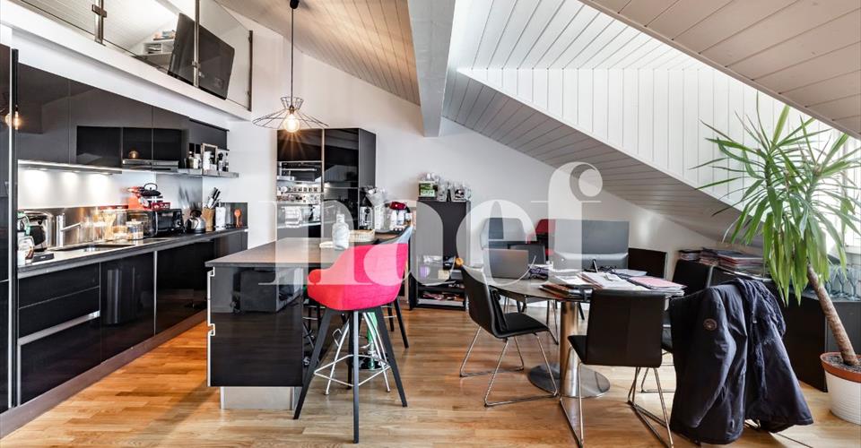Ce très bel appartement de 4.5 pièces en duplex se trouve au dernier étage d’un petit immeuble de village à Veyrier. La résidence offre une quiétude de vie à seulement quelques minutes du centre de Genève. Il profite de la proximité des commerces, des écoles et des transports publics. Profitant d’une magnifique vue dégagée sur le Salève et d’un environnement verdoyant, cet appartement bénéficie d’une surface PPE de 119 m² et se compose comme suit: – un hall d’entrée avec des rangements – une cuisine ouverte agencée et équipée – un salon avec cheminée – une suite parentale mansardée avec dressing et salle de bains – une chambre d’enfant mansardée avec velux – une salle de douche avec toilettes – une mezzanine pouvant faire office d’une troisième chambre ou de bureau Deux box en sous-sol et une cave complètent ce bien.