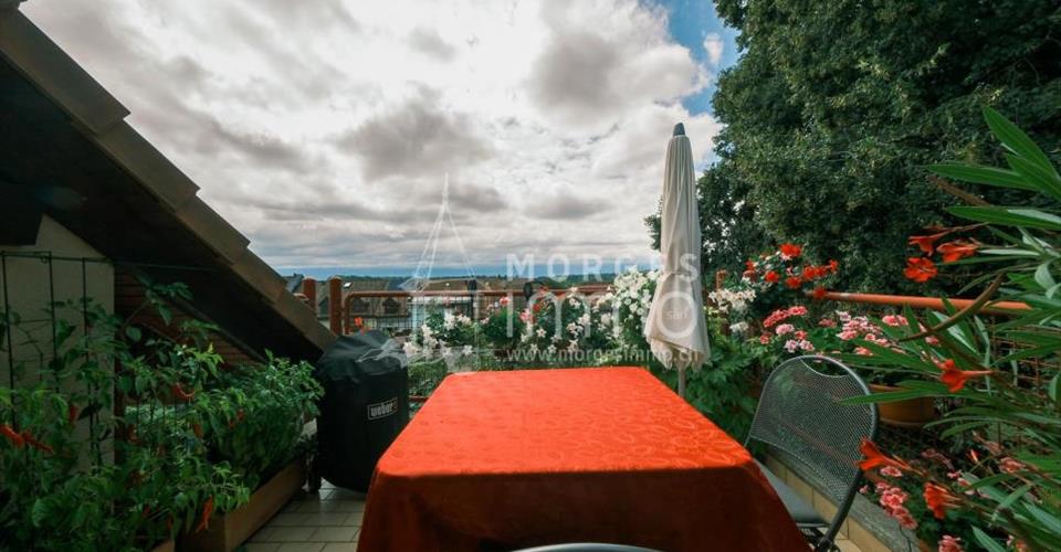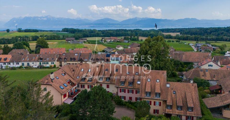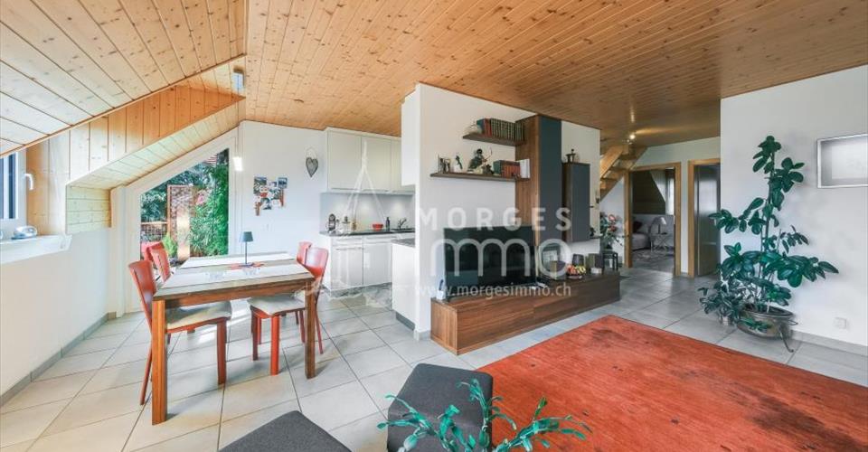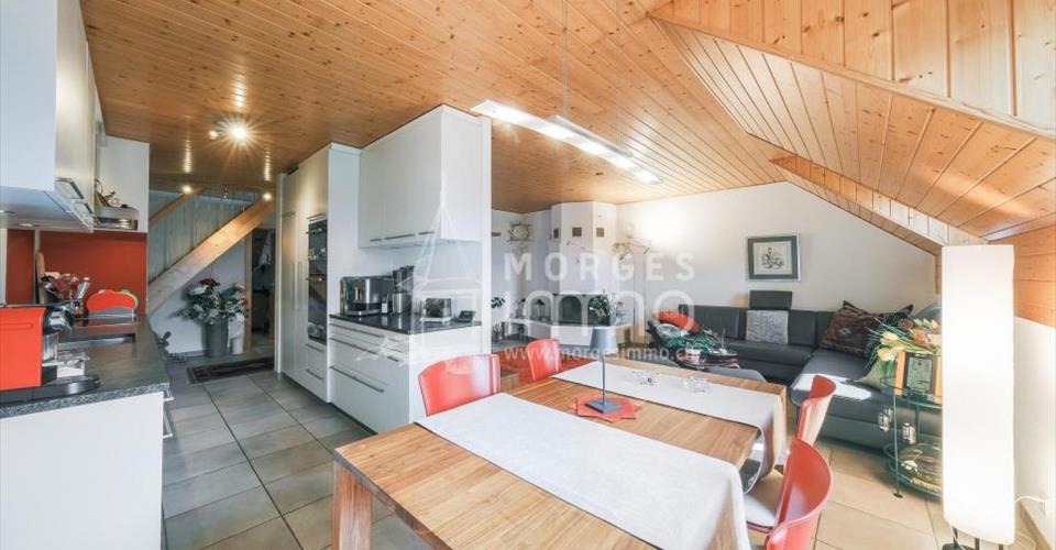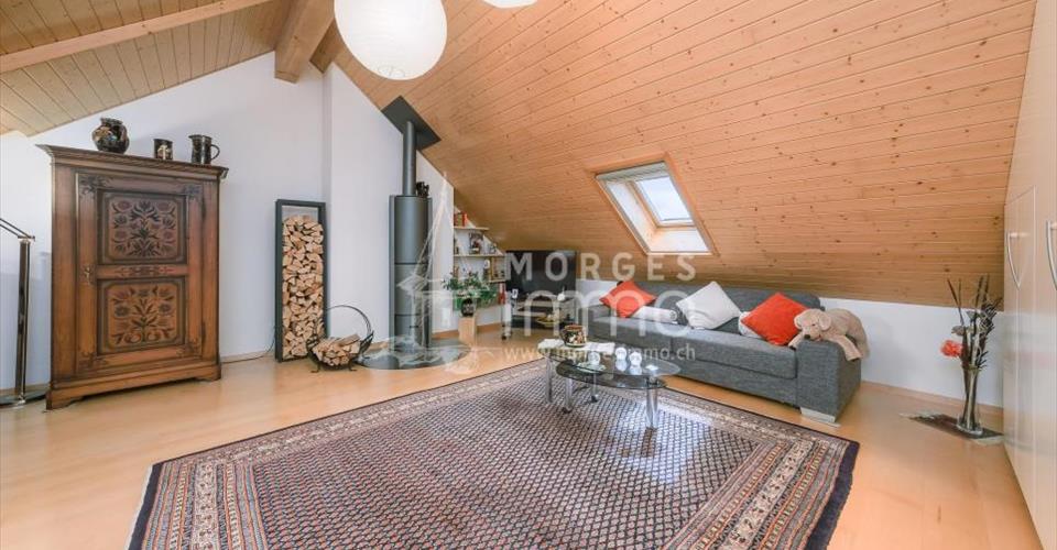 A deux pas du centre du village, charmant appartement 4.5 pièces en duplex, avec une magnifique vue sur les Alpes par dessus les toits, sis dans les combles et surcombles dans une jolie résidence en PPE. Toujours très bien entretenu au fil des années, quelques rénovations ont été apportées, notamment le remplacement de la cuisine et de la salle de douche. Disposé comme suit : Combles – Accès au 2ème étage par un escalier intérieur (sans ascenseur) – Hall de dégagement – Salle d’eau avec douche, wc et lavabo – Belle cuisine récente, entièrement agencée, ouverte sur la salle à manger avec accès sur un magnifique balcon orienté Sud – Séjour avec belle cheminée (foyer fermé) – Salle d’eau avec baignoire, wc et lavabo – Grande chambre d’env. 12 m2 – Grande chambre d’env. 14 m2 – Chambre d’env. 11 m2 orientée Sud Surcombles – Accès par un escalier droit – Grand disponible d’env. 60 m2 avec armoires encastrées et poêle à bois à accumulation – Grand réduit avec armoires encastrées + buanderie privative équipée d’une colonne de lavage séchage (possibilité de créer une salle d’eau supplémentaire) Sous-sol – Grande cave inclue dans le prix – Grand local privatif d’env. 20 m2 en sus CHF 30’000.00 – Une place de parking intérieure en sus CHF 35’000.00 Extérieurs – Une place de parking en servitude