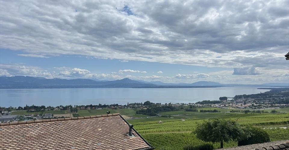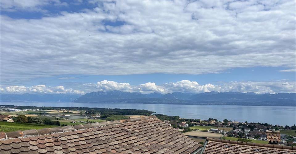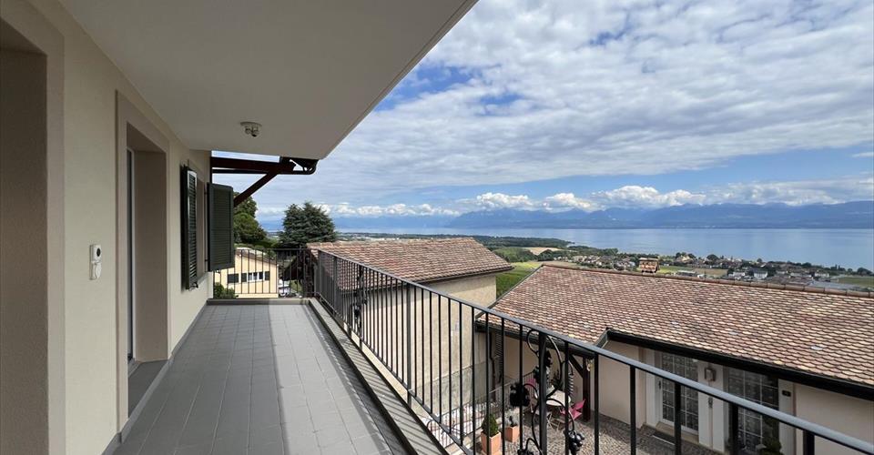 Situé dans le charmant village viticole de Bougy-Villars, cet appartement lumineux de 120 m² séduit par sa vue à couper le souffle sur le lac Léman et les montagnes. Il est idéal pour une famille à la recherche d’un cadre de vie calme, spacieux et proche de la nature. Surface habitable : 120 m² Balcon : 10 m² avec vue panoramique Nombre de pièces : 4.5 Nombre de chambres : 3 Salle de bains : 1 avec baignoire WC : 1 WC séparé Cheminée : oui, dans le salon Cuisine : entièrement équipée Débarras Annexes : cave Buanderie : avec lave-linge et sèche-linge Stationnement : pas de place privée, mais autorisation de stationnement sur toute la commune (CHF 50.-/mois) + parking communal à proximité Disponibilité : immédiate Il se compose ainsi : 1 hall d’entrée 1 séjour avec cheminée et accès au balcon 1 cuisine équipée 3 chambres 1 salle de bains avec baignoire 1 WC séparé 1 débarras 1 cave 1 buanderie avec machines Atouts : vue exceptionnelle, grand balcon, lumineux, charme du village, parfait pour une famille, proche de toutes les commodités de Rolle et Morges. Loyer mensuel : CHF 2’700.- Charges : CHF 250.- Disponibilité : immédiate Pour plus d’informations et visites, contactez Monsieur Chabbouh SEGIMO SA Groupe immobilier Visitez notre site internet : www.segimo.ch Tél. 0848 007 001