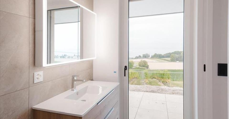Deux immeubles neufs idéalement situés entre le lac et les vignes, dans un environnement paisible et lumineux. Chaque bâtiment abrite quatre appartements conçus avec attention : de beaux volumes, des matériaux de qualité et des finitions soignées offrent un cadre de vie à la fois confortable et contemporain. Les résidences bénéficient d’un emplacement pratique, à proximité des commodités et des axes de communication. Le lot n°B1 de 4,5 pièces se décline de la manière suivante : – Un hall d’entrée avec armoire intégrée, – Une cuisine ouverte sur le séjour, – Une chambre parentale avec dressing, une salle de douche/WC, – Une chambre avec salle de douche/WC, – Une chambre, – Une salle de bains/WC, – Une terrasse entourée de verdure avec vue sur le lac. Loyer : CHF 5’050.00 Charges : CHF 200.00 Place de parc intérieure : CHF 200.00 Disponibilité de suite Pour tout complément d’information au sujet de ces biens d’exception, n’hésitez pas à contacter notre service location.