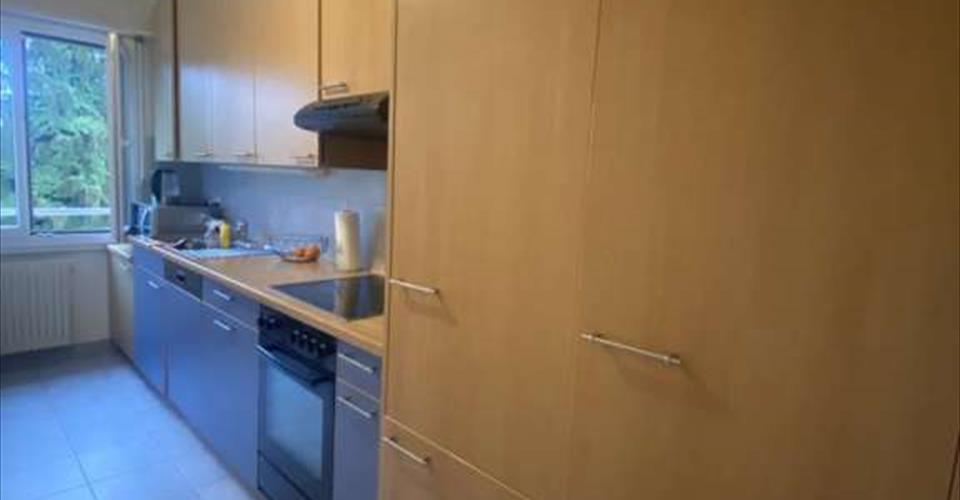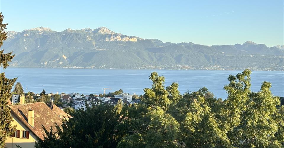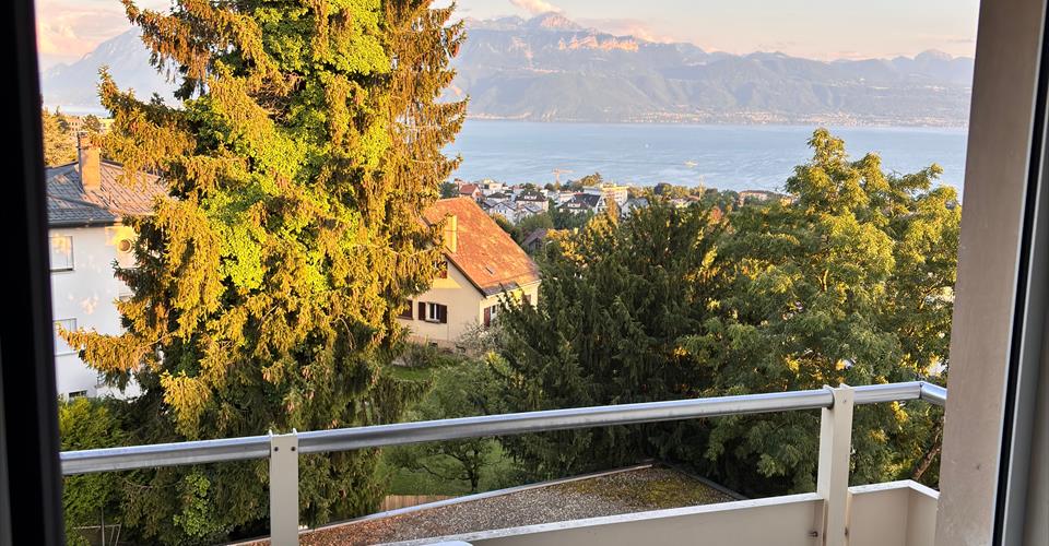 vue sur le lac au 3e étage avec ascenseur, Sud-Est, 3 chambres à coucher, cuisine agencée, salle de bains rénovée. Garage-box Fr. 180.-, place de parc intérieure Fr. 140.-