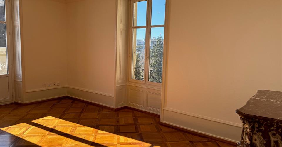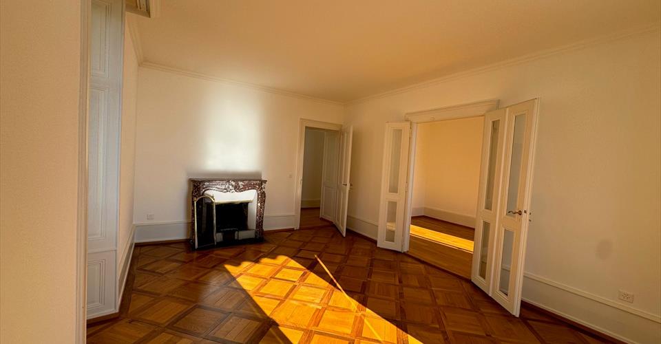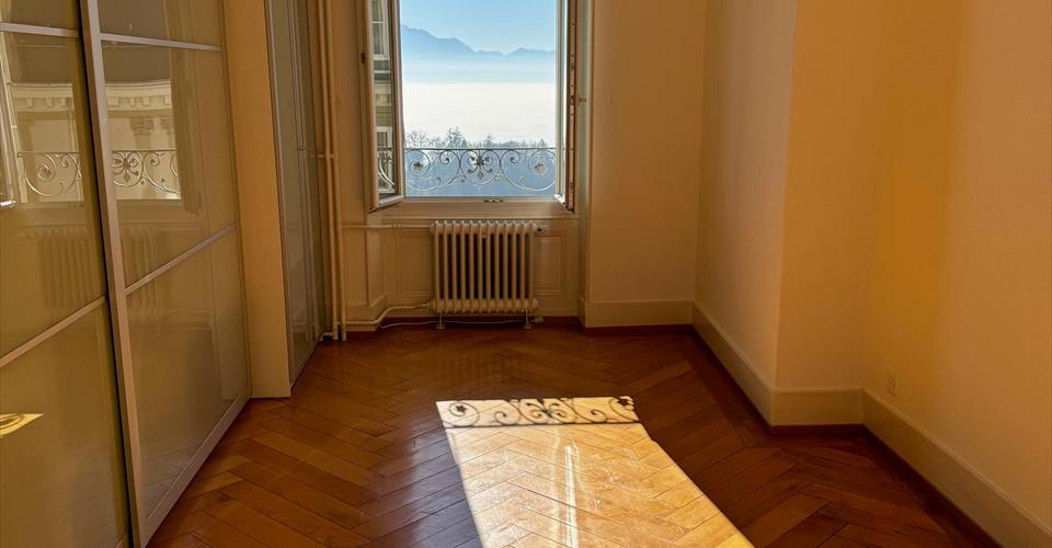 Avenue de Rumine 48 – 4 ½ pièces superbe vue sur le lac et les Alpes Magnifique appartement avec cachet de 4 ½ dans un immeuble ancien de qualité, vue lac panoramique, rénové, salon avec cheminée, salle-à-manger, deux chambres, salle-de-bain, wc séparé, balcon, plafonds avec moulures, parquet en chêne. Ascenseur, cave, galetas, place de parc Loyer: chf 3250.-, + charges. Place de parc à chf 250.-/mois disponible. Libre de suite