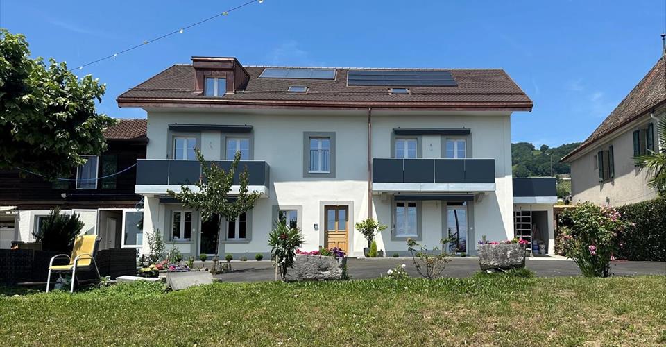 Magnifique appartement dans maison villageoise rénovée à Mont-sur-Rolle Dans maison villageoise entièrement rénovée à Mont-sur-Rolle comprenant trois appartements, située à 3 minutes de l’entrée de l’autoroute et offrant une vue ouverte sur le lac, magnifique appartement neuf de 4.5 pièces au rez-de-chaussée d’une surface pondérée de 112 m2 comprenant : – Séjour – salle à manger – cuisine de 42 m2 – 3 chambres à coucher de 12.5 à 20 m2 – 2 salles d’eau – Espace extérieur privatif de 18m2 En bonus, non compté dans la surface pondérée : un espace disponible de 10.5 m2 pouvant être aménagé en dressing, salle de sport, atelier ou autre. Possibilité de louer une place de parc extérieure. Loyer mensuel : CHF 3’650.- + charges CHF 280.- + place de parc CHF 150.-. Appartement disponible dès le 01.06.2025, travaux en cours de finition. Visites : M. Arifi