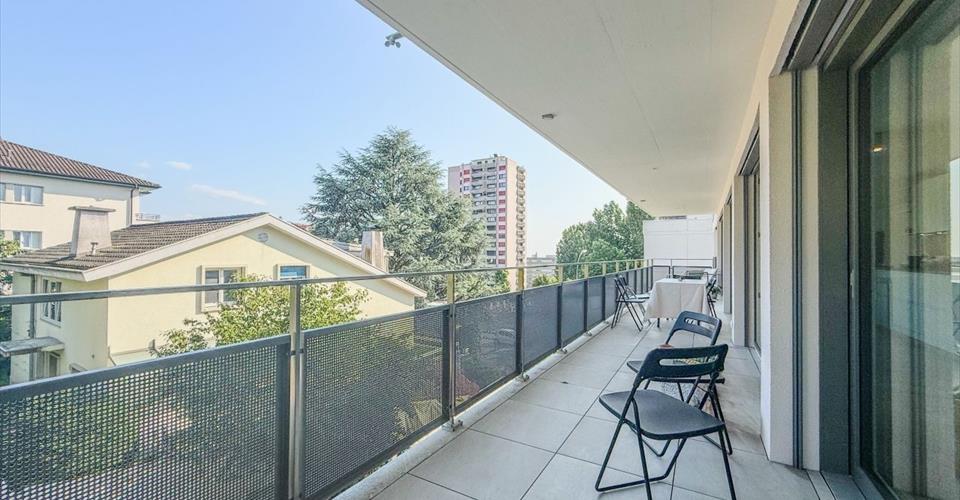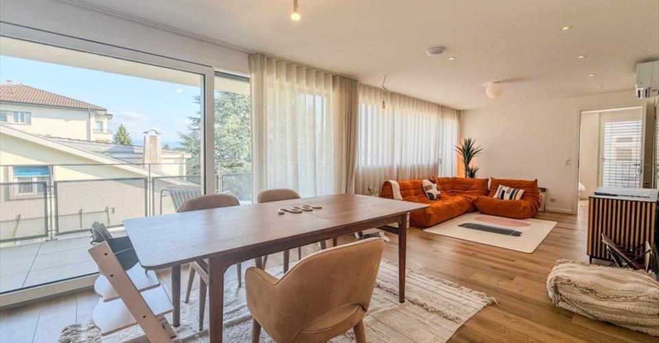 Découvrez ce superbe appartement de 4.5 pièces offrant 130 m² PPE idéalement répartis pour une qualité de vie optimale. Situé dans un environnement paisible, ce bien séduit par son agencement intelligent, ses volumes généreux et sa luminosité naturelle. La cuisine ouverte, entièrement équipée et dotée de nombreux rangements, s’intègre harmonieusement à un espace de vie spacieux et baigné de lumière, qui s’ouvre sur une grande terrasse de 25m². Un lieu parfait pour vos moments de détente en extérieur ou pour recevoir. L’appartement se distingue également par ses 4 salles de bain, une rareté qui garantit confort et intimité pour chaque membre du foyer ou pour des invités. L’ascenseur arrivant directement à l’étage ajoute une touche exclusive, renforçant l’accessibilité et le confort au quotidien. Prestations haut de gamme : – Deux places de parking intérieures (CHF 2 x 150.- en sus), chacune équipée d’une borne de recharge pour véhicules électriques – Système de climatisation intégré pour un confort thermique optimal en toutes saisons Panneaux solaires, une solution durable et économique pour une meilleure efficacité énergétique – Proche des commerces et transports publics – État général impeccable, aucun travaux à prévoir – Un bien rare sur le marché, offrant une belle valeur ajoutée grâce à ses prestations modernes et durables Loyer: 3’800.- Charges: 400.- (Chauffage, eau chaude, internet) Parking: 2×150.- Disponible dès maintenant Pour tout complément d’information ou pour organiser une visite, contactez-nous à