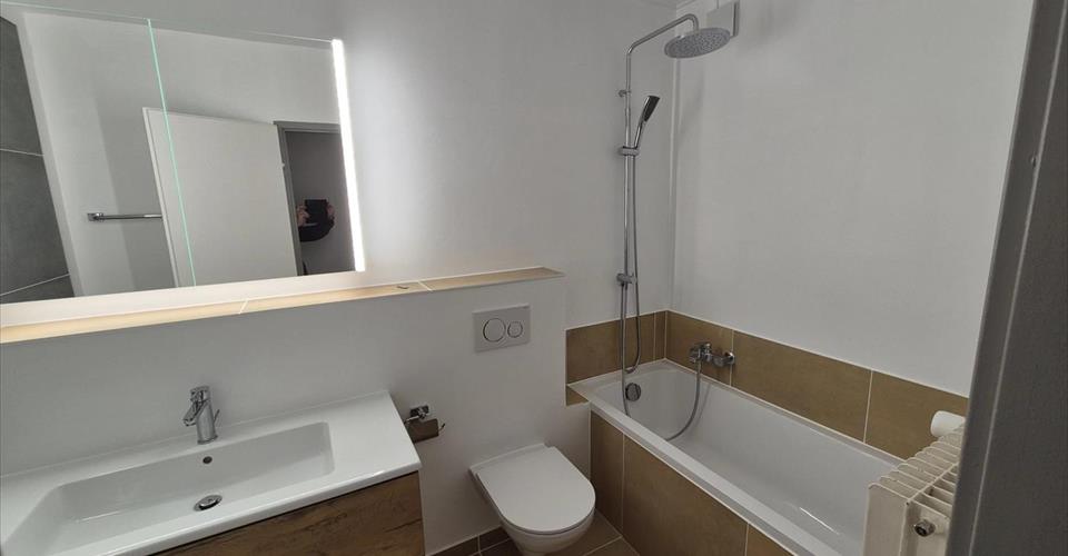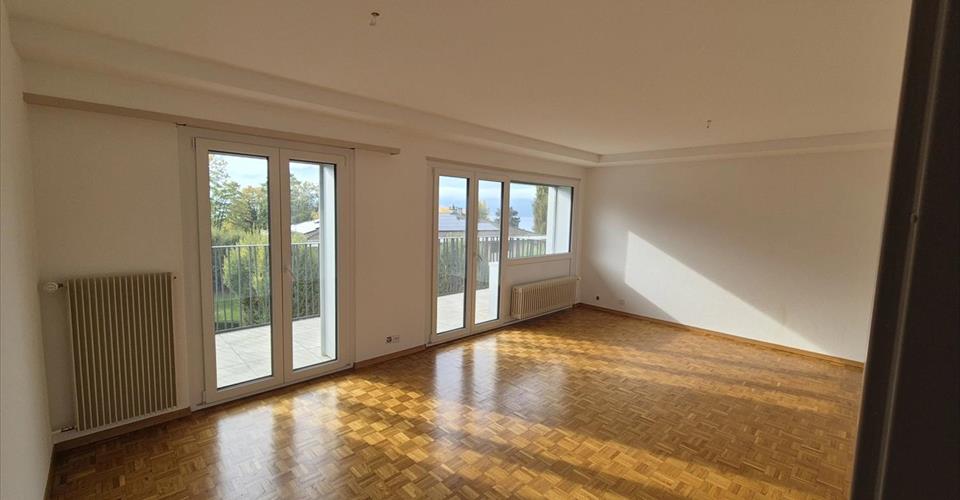 Appartement 4.5 pièces Appartement de 4.5 pièces traversant, rénové avec goût sur les hauteurs de Vevey, distribué comme suit : Spacieux hall d’entrée avec armoires, Grand et lumineux séjour avec accès au balcon Sud-Ouest, Cuisine fermée agencée à neuf avec accès balcon 3 chambres à coucher dont une avec balcon Ouest, Une salle de douches/WC Une salle de bains/WC Une cave Possibilité de louer une place de parc pour CHF 100.- Situé dans un cadre de verdure et offrant une jolie vue sur le lac, l’immeuble vient de faire l’objet d’une rénovation énergétique